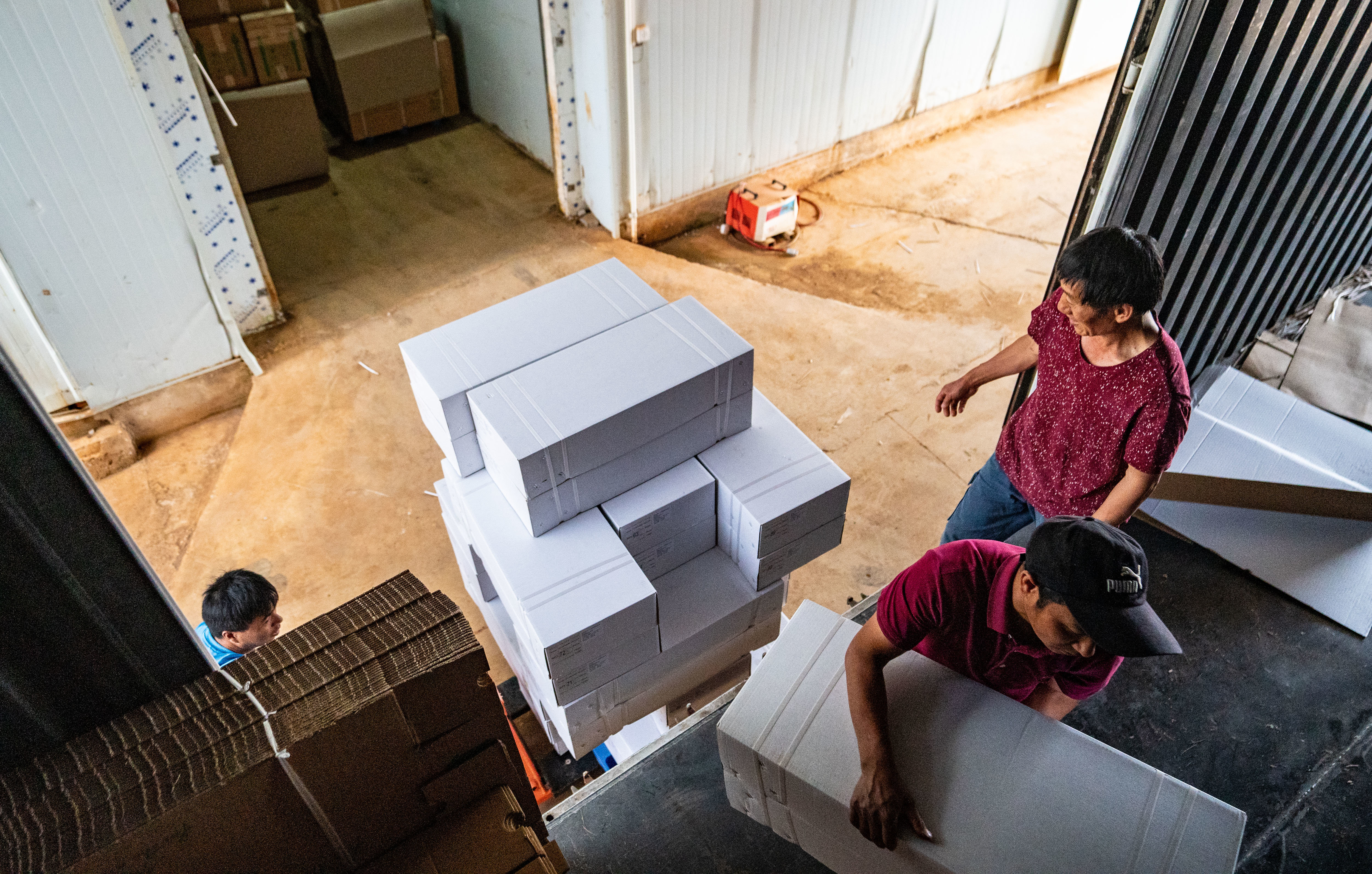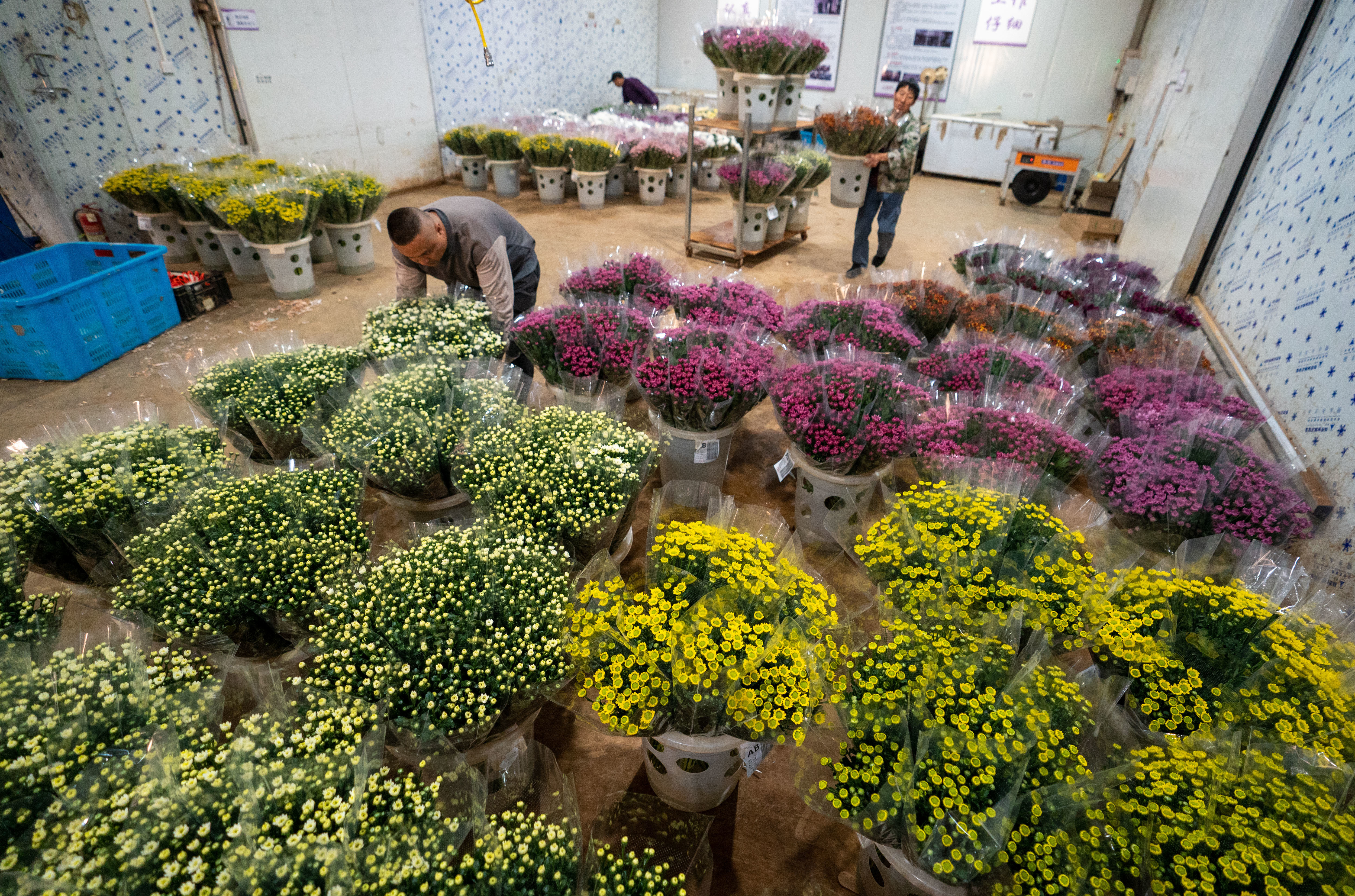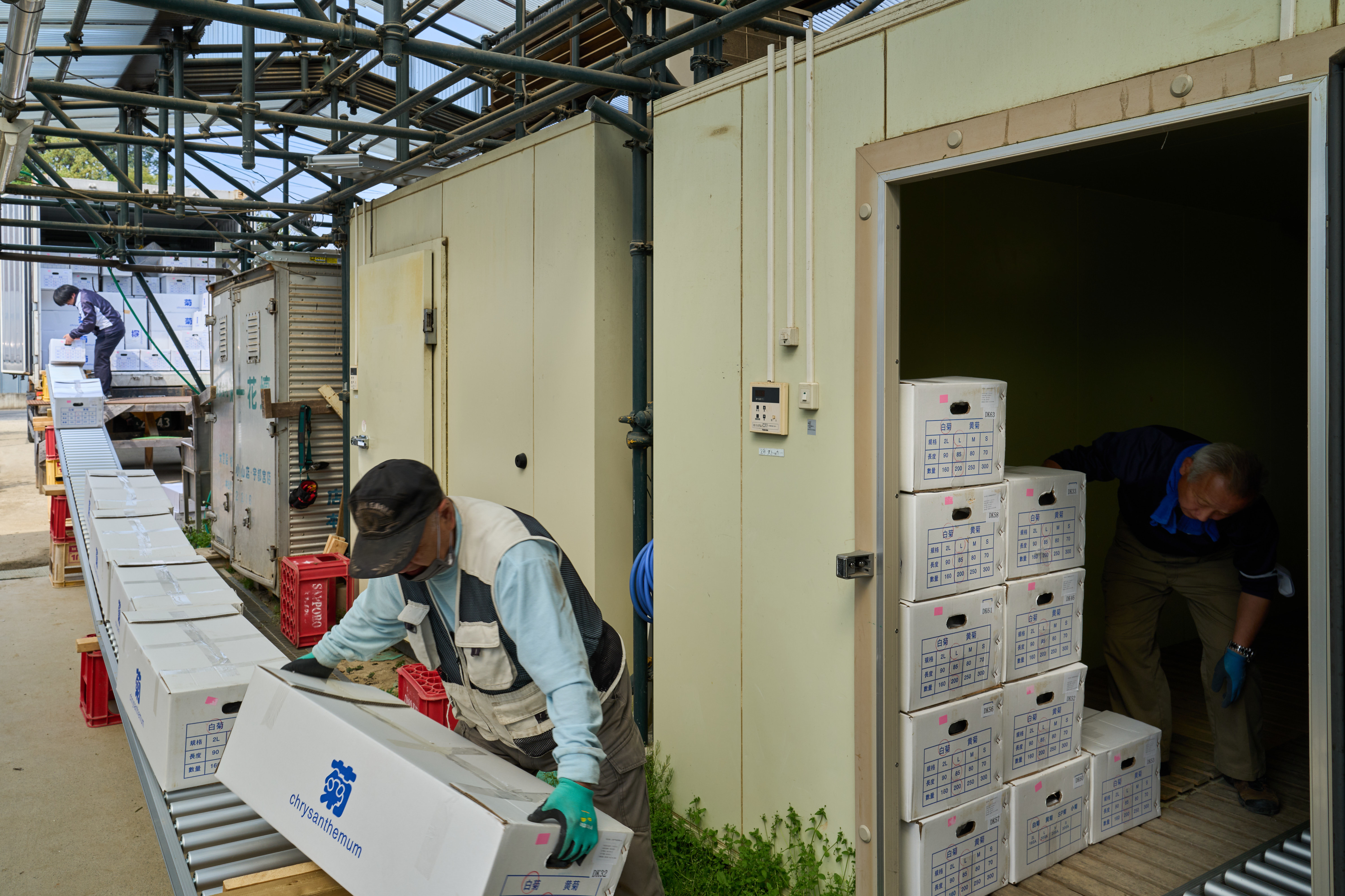 在日本埼玉县埼玉市的园艺中心,工人将从中国云南进口的鲜花运进一家花卉公司的仓库(4月5日摄)。在日本的埼玉县,小西武2022年创立了自己的花卉公司,从中国云南进口鲜切花,销售给分销商、鲜花加工厂以及花店。他最近一批进口鲜花来自云南开远。新华社记者 张笑宇 摄