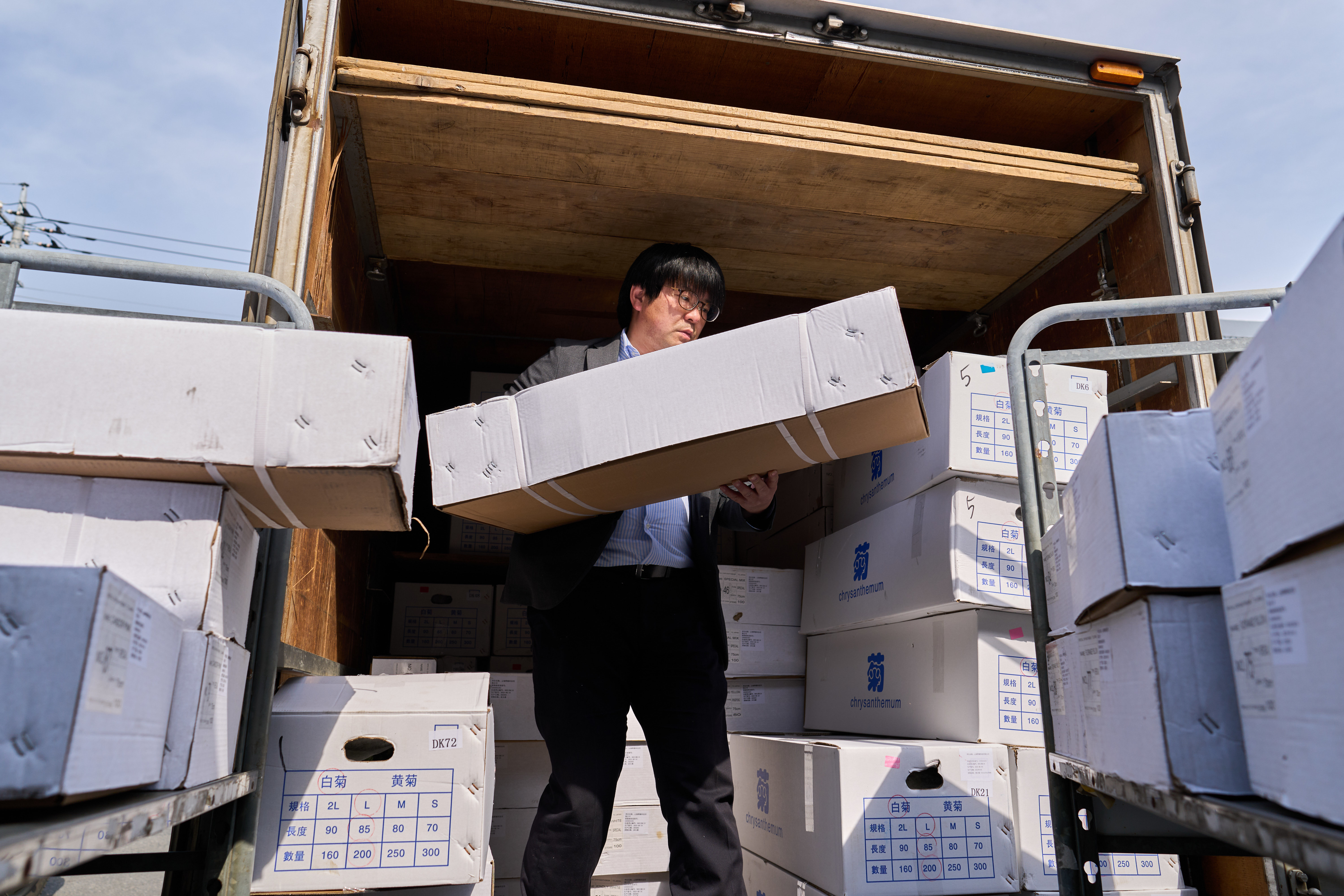 在日本埼玉县北葛饰郡,小西武将当日到货的中国云南进口鲜花卖给一家鲜花加工厂(4月3日摄)。新华社记者 张笑宇 摄