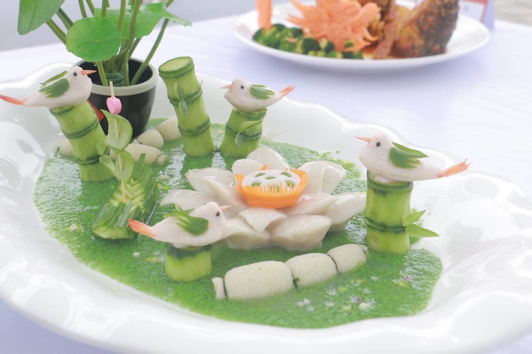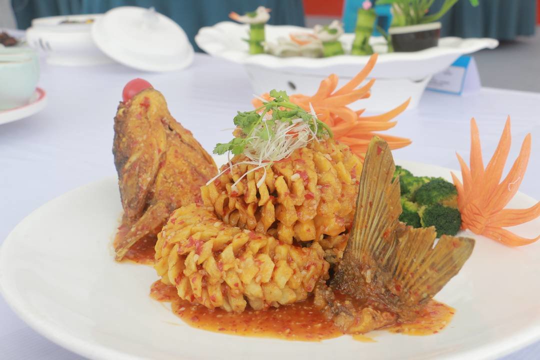 比赛现场,选手们纷纷拿出自己的拿手绝活,讲究刀法、火候、放料,讲求形、色、香、味一应俱全,在规定时间内挥刀弄铲、煎炸烹炖,用灵巧的双手和完美的创意设计制作出了养生酒香鱼丸、百花豆花鱼、醉鱼、锦绣醉牡丹、糟香龙爪菊、酒香果味红烧肉等好听好看又好吃的特色菜品,一时间现场美味飘香,惹得在场观众垂涎欲滴。