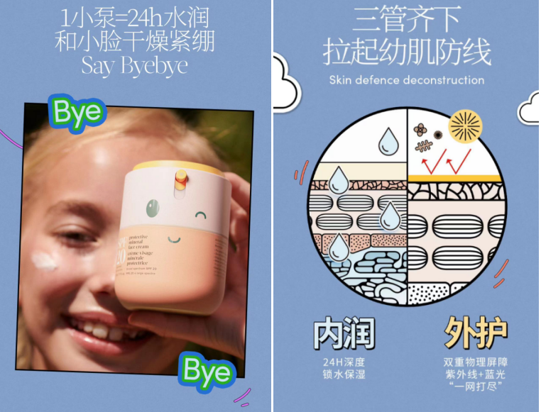 进入学龄阶段,宝宝开始形成自主意识,逐渐想要自己穿衣服、自己洗脸、自己涂面霜,由妈妈护肤逐渐过渡到自主护肤。另外,宝宝在托班、幼儿园会遇到更多同龄小伙伴,并开始和小伙伴一起学习、游戏,相互模仿,护肤面霜也逐渐成为一个可以让他们引以为豪的“社交产品”。