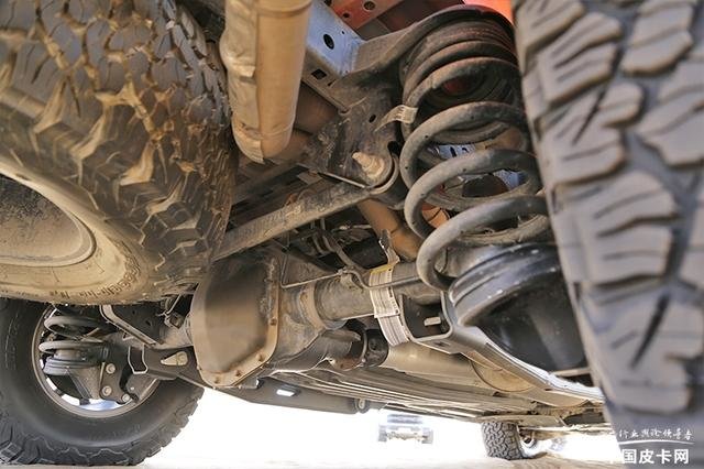 而翻越沙梁的时候,也会有类似交叉轴的路况,这对悬架拉伸行程又有很高的要求。依托加长行程的前双叉臂悬架,以及能够实现超长行程的定制款超长拖臂,让我们的车辆在遇到坑洼和翻越沙梁的情况时,保证车轮尽量接触地面。从外面直观的就可以看出前后轮与轮拱的间距在不断拉大,完全不用为悬架行程操心。