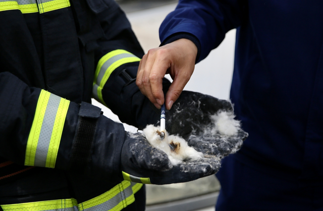 未掐灭的烟头放到杨柳絮中,烟头周围的杨柳絮会迅速变黑碳化,并有微小火星的产生。据消防员介绍,未熄灭烟头的温度可达600到800度,引燃杨柳絮轻而易举。