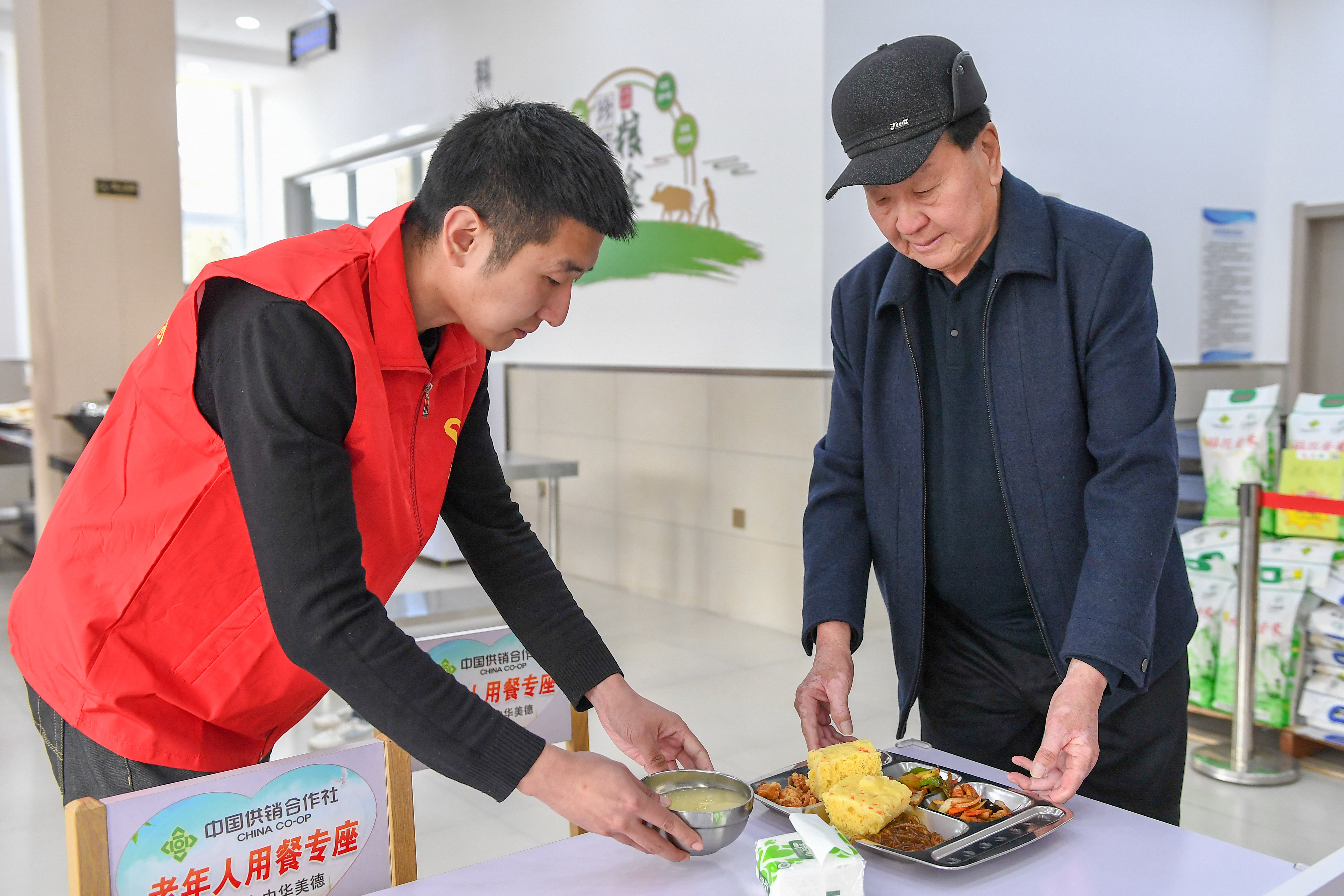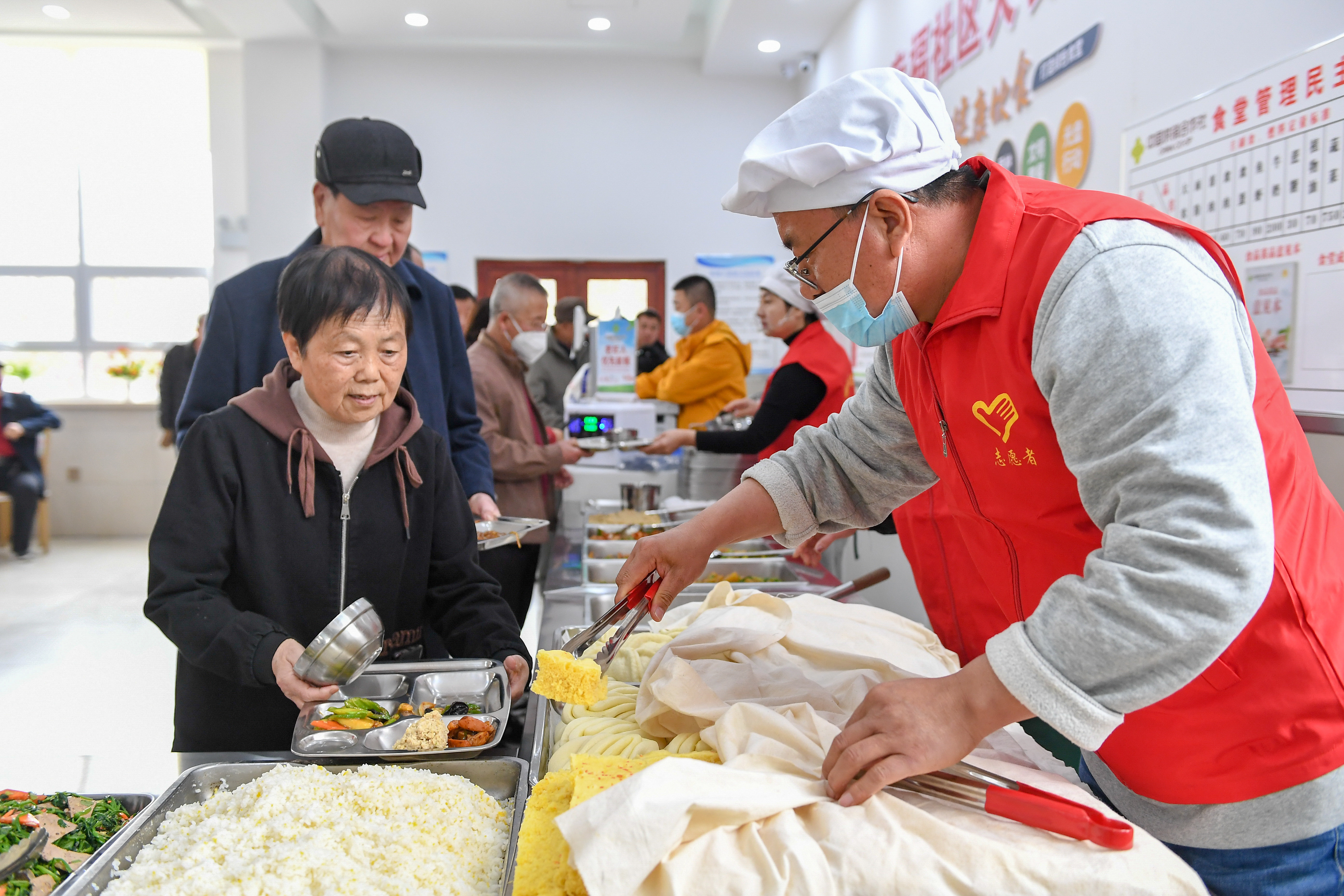 4月14日,在吉林省四平市梨树县幸福社区食堂,志愿者为老人盛菜。该食堂是吉林省民政厅重点支持的100个社区老年食堂之一。新华社记者 张楠 摄