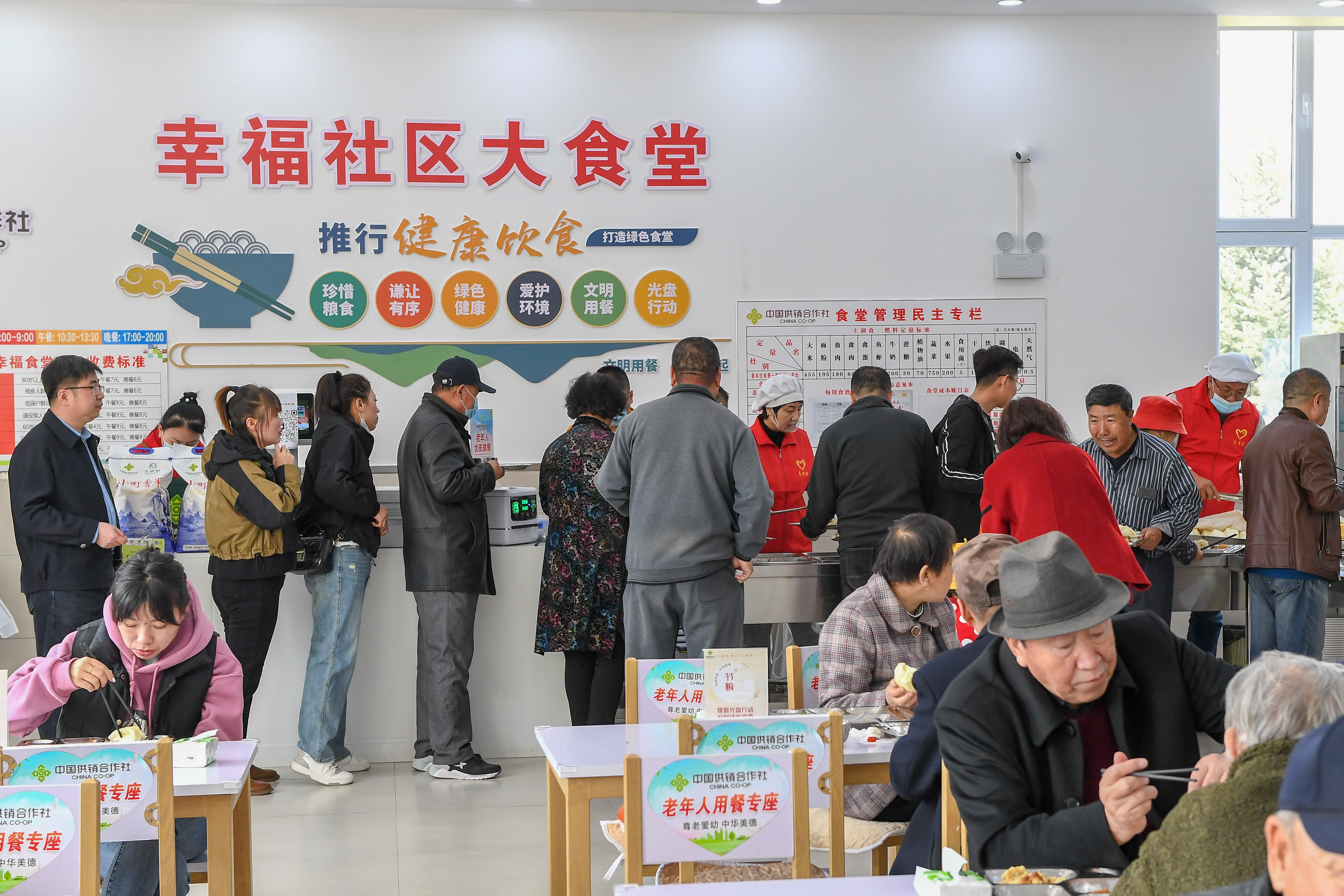 4月14日,就餐者在吉林省四平市梨树县幸福社区食堂排队。该食堂是吉林省民政厅重点支持的100个社区老年食堂之一。新华社记者 张楠 摄