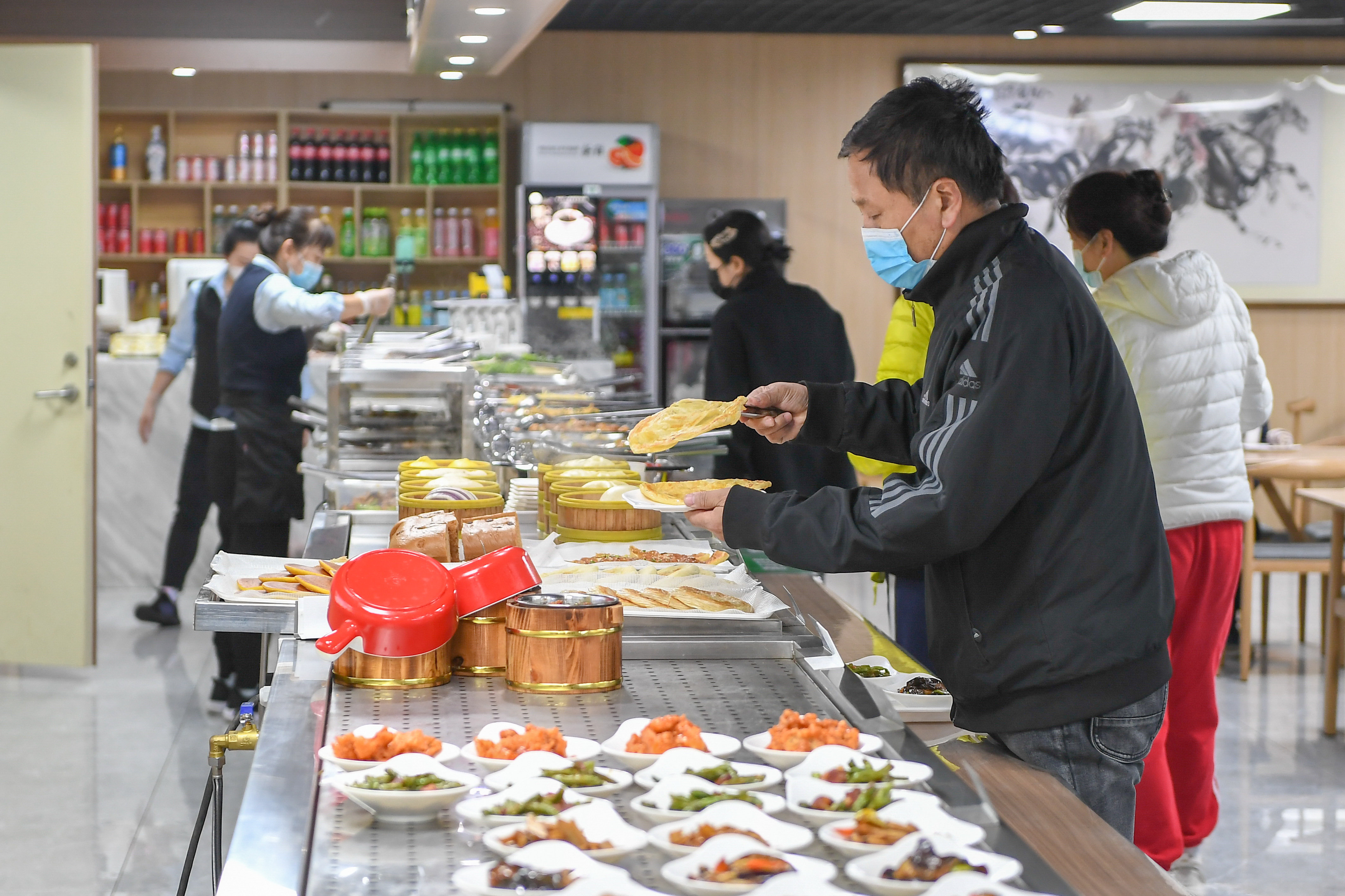 4月11日,在吉林省长春市朝阳区光明社区食堂,工作人员在摆放菜品。该食堂是吉林省民政厅重点支持的100个社区老年食堂之一。新华社记者 张楠 摄