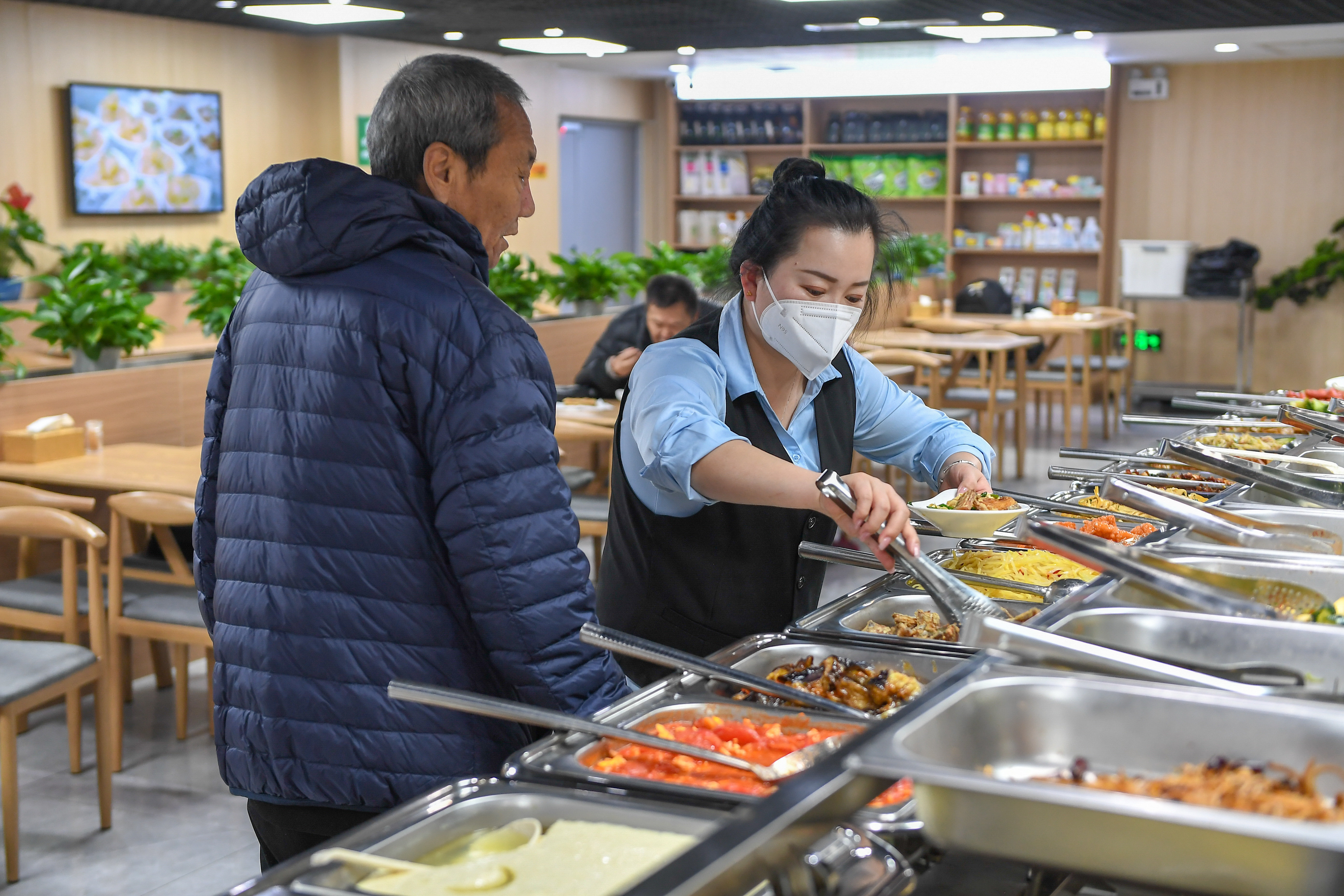 4月11日,在吉林省长春市朝阳区光明社区食堂,工作人员为老人盛菜。该食堂是吉林省民政厅重点支持的100个社区老年食堂之一。新华社记者 张楠 摄