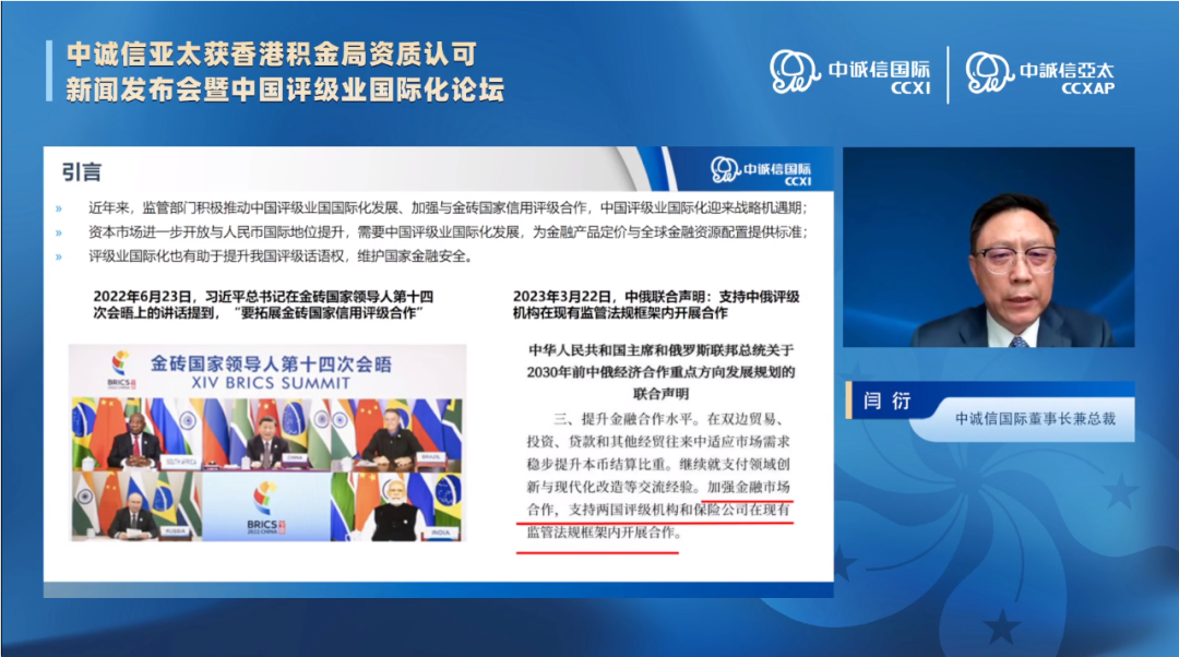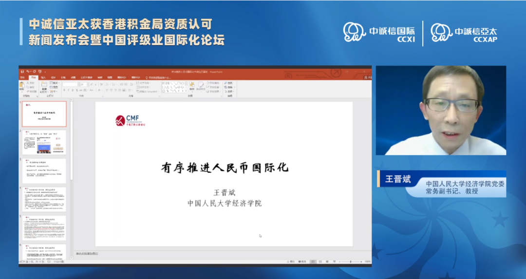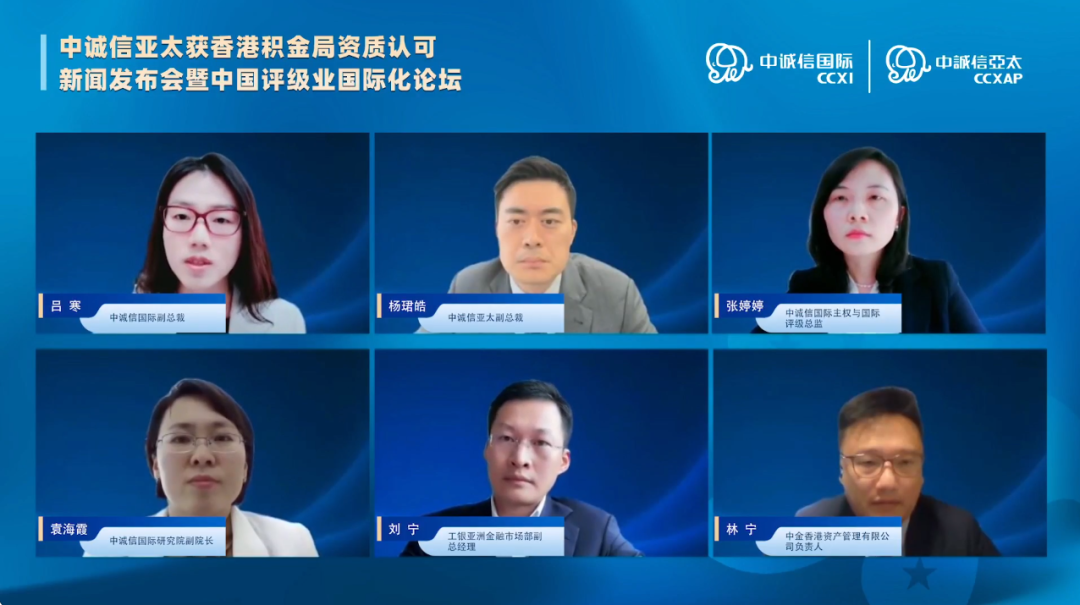 由中诚信国际及旗下中诚信亚太共同主办的“中诚信亚太获香港积金局资质认可新闻发布会暨中国评级业国际化论坛”于4月12日在线上举办。本次论坛邀请来自监管部门、金融机构、知名高校的专家学者,共同探讨人民币国际化的大背景下,中国评级业如何“走出去”,传播本土评级机构的声音。来自国内外各金融机构、研究机构、新闻媒体的代表和投资人线上参与论坛。