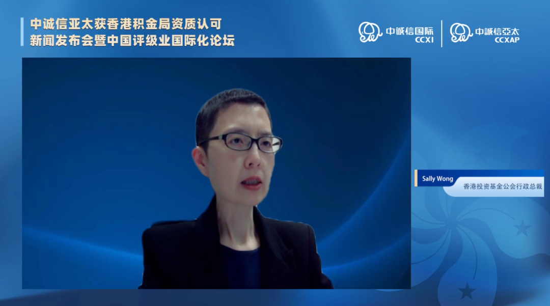 香港投资基金公会行政总裁Sally Wong致开幕辞。她对中诚信亚太获得香港积金局资质认可表示祝贺,介绍了香港积金局“强积金计划”的背景及投资机会,并鼓励中诚信亚太积极拓展在香港地区的相关业务,为推动中资机构评级行业的转型和国际化贡献力量。