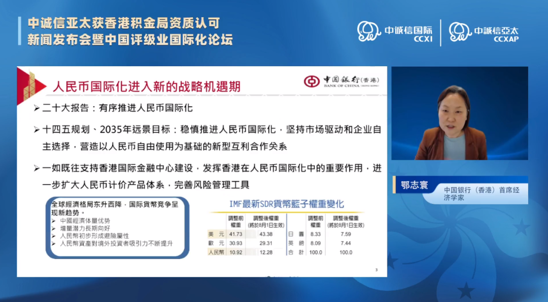 中国银行(香港)首席经济学家鄂志寰发布了题为《从人民币国际化看债券市场制度型开放》的主题演讲。她从人民币国际化进入新的战略机遇期、债券通推动中国债券市场制度性开放、促进离岸市场与在岸市场良性循环等方面进行了深入分析。