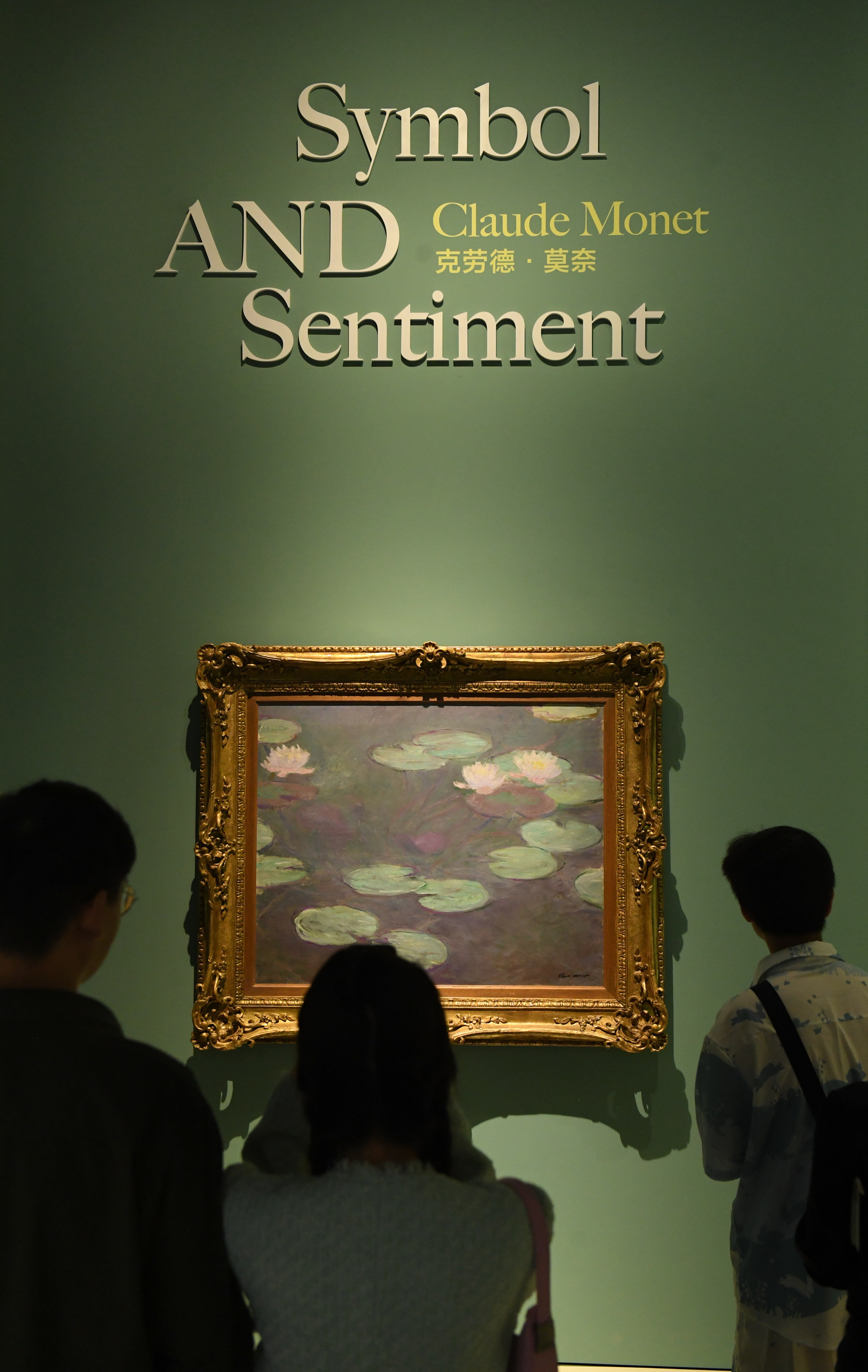 4月14日,观众参观克劳德·莫奈画作《粉色睡莲》。新华社记者 翁忻旸 摄