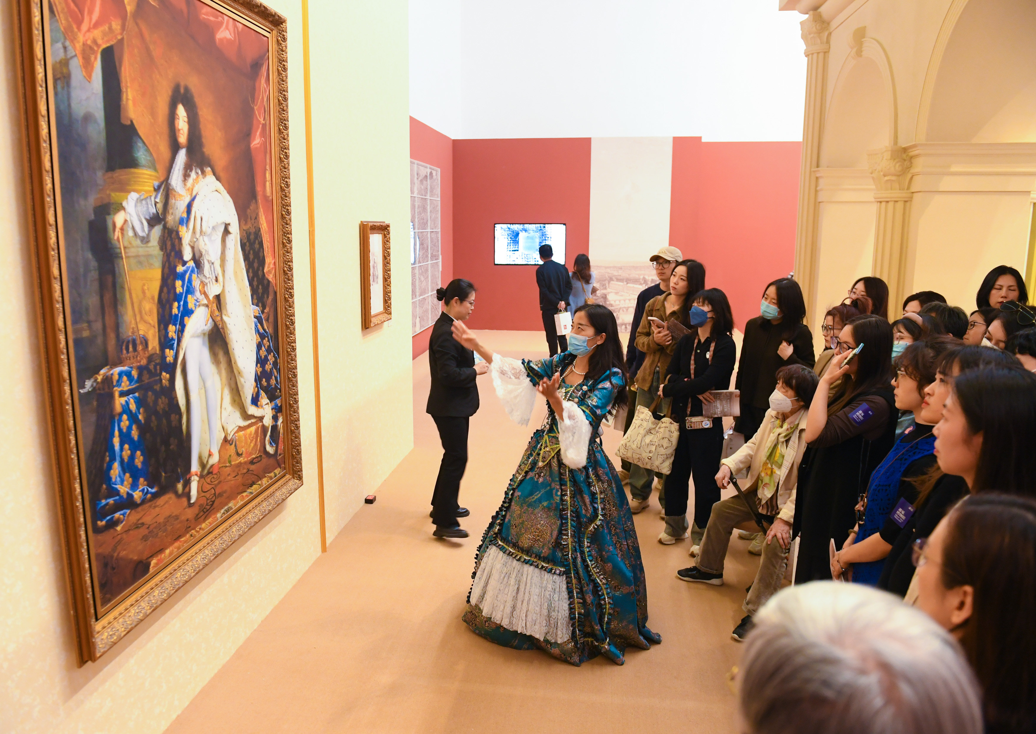 4月14日,工作人员向观众介绍路易十四肖像(左)和依据此画创作的19世纪蚀刻版画作品(右)。新华社记者 翁忻旸 摄