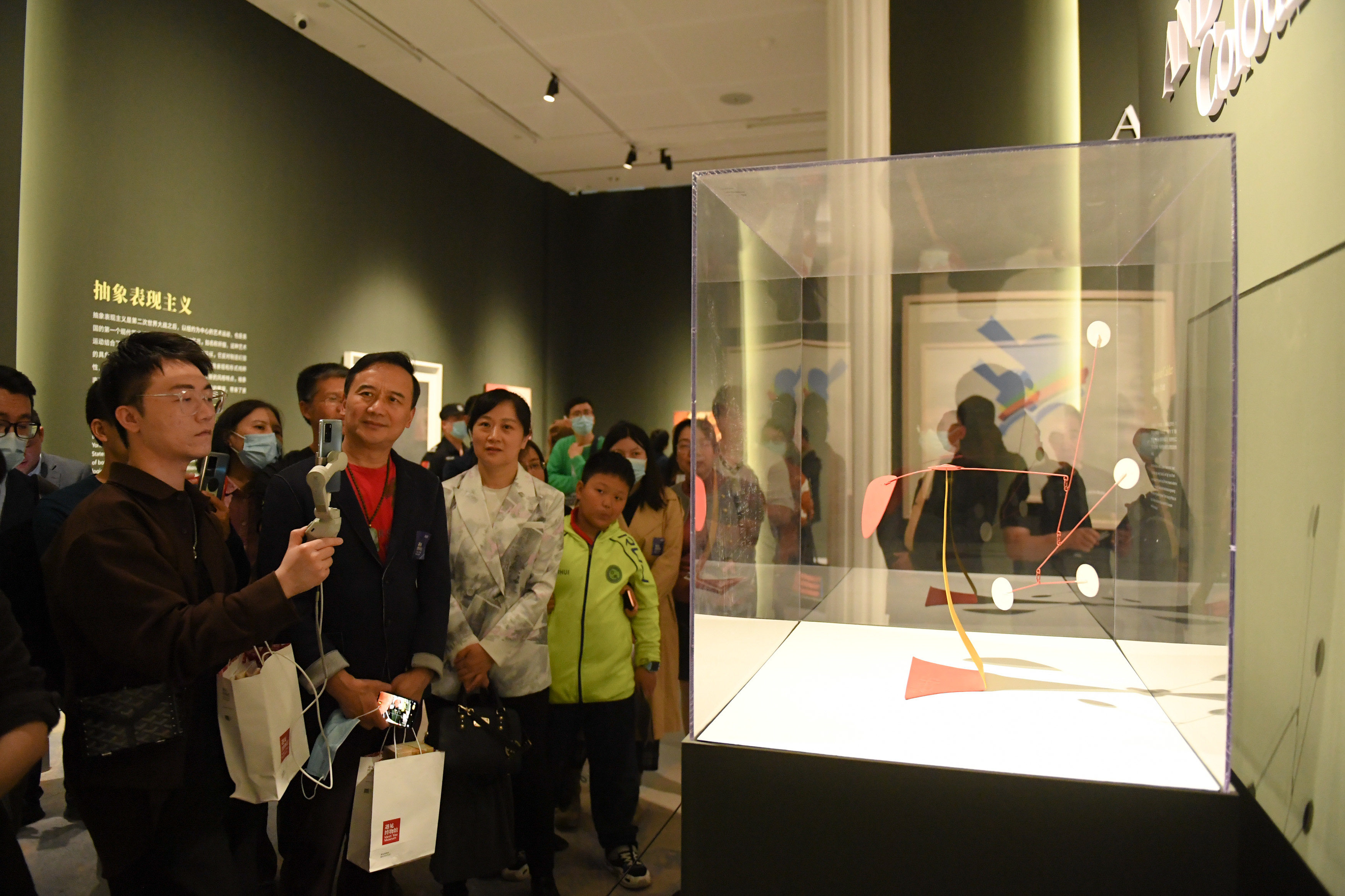 4月14日,观众参观亚历山大·考尔德装置作品《四个白色圆盘和红色橡胶》。新华社记者 翁忻旸 摄