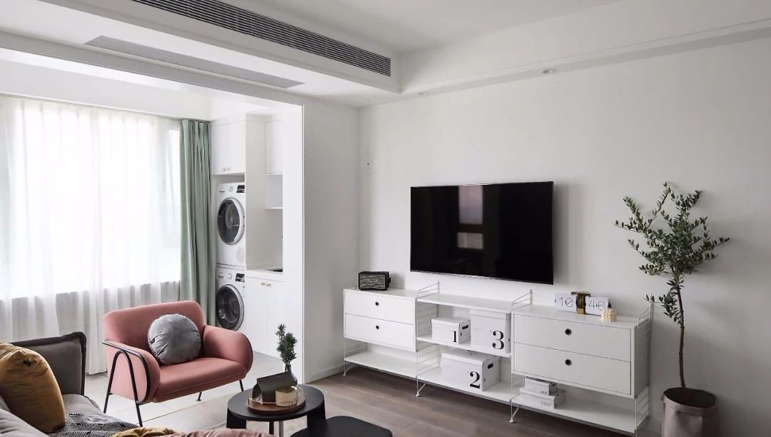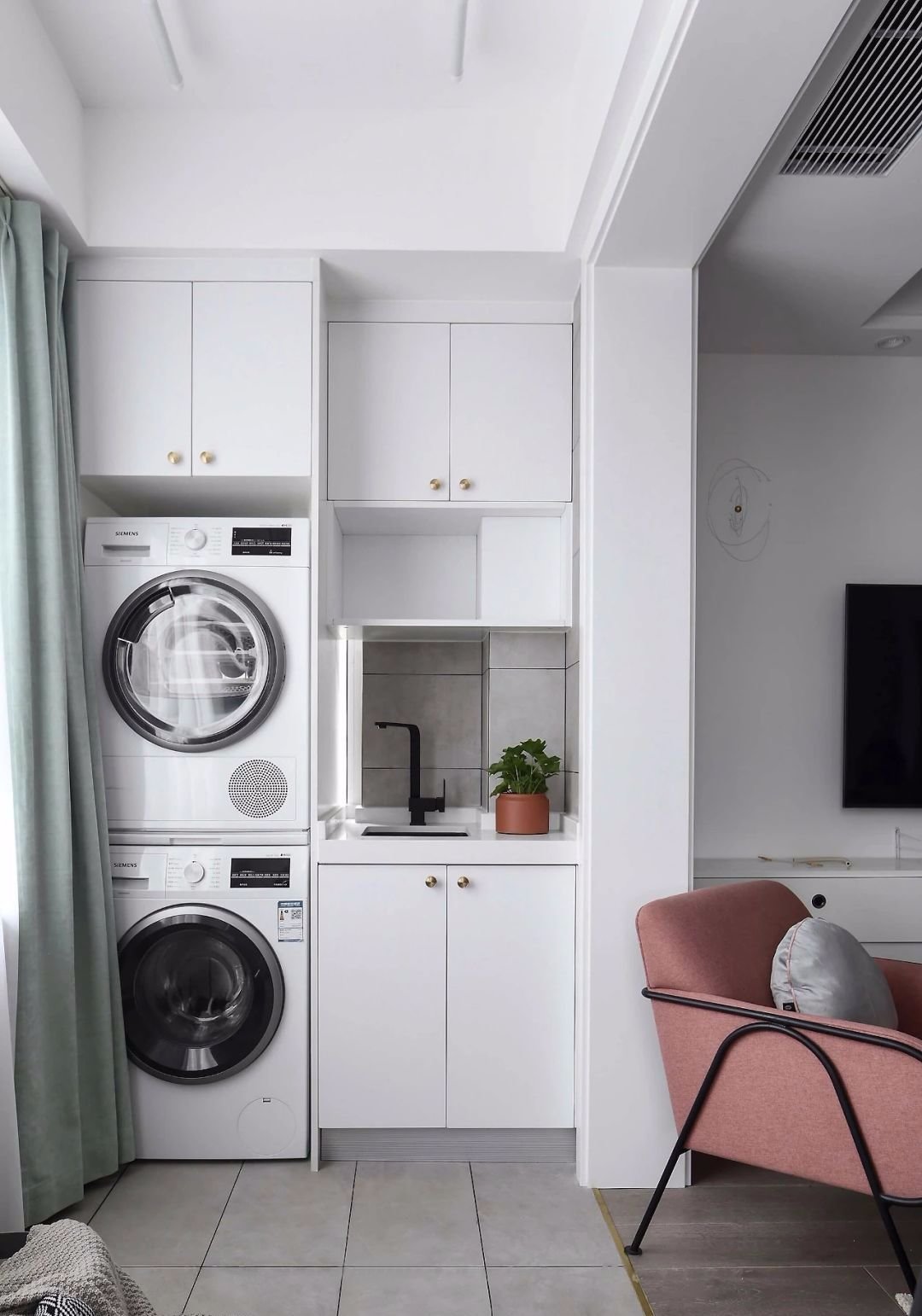 阳台一侧定制吊柜+洗手池组合设计,也将洗衣机和烘干机叠放并嵌入柜体之中,让空间得到充分的利用。