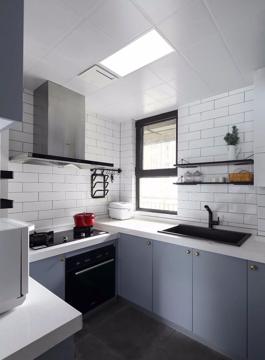 厨房面积不大,利用户型打造U型橱柜设计,动线更加顺畅。在墙面上设计了一些置物架,大大提升了厨房的收纳空间。