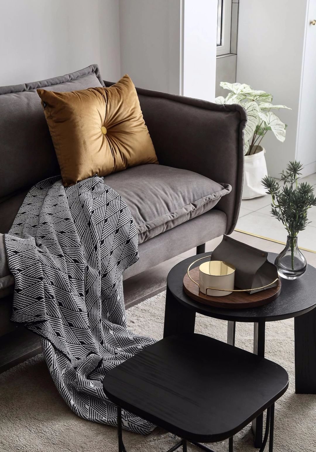 色彩浓郁的灰色沙发与抱枕搭配,恰到好处的中和了空间里的淡色系。