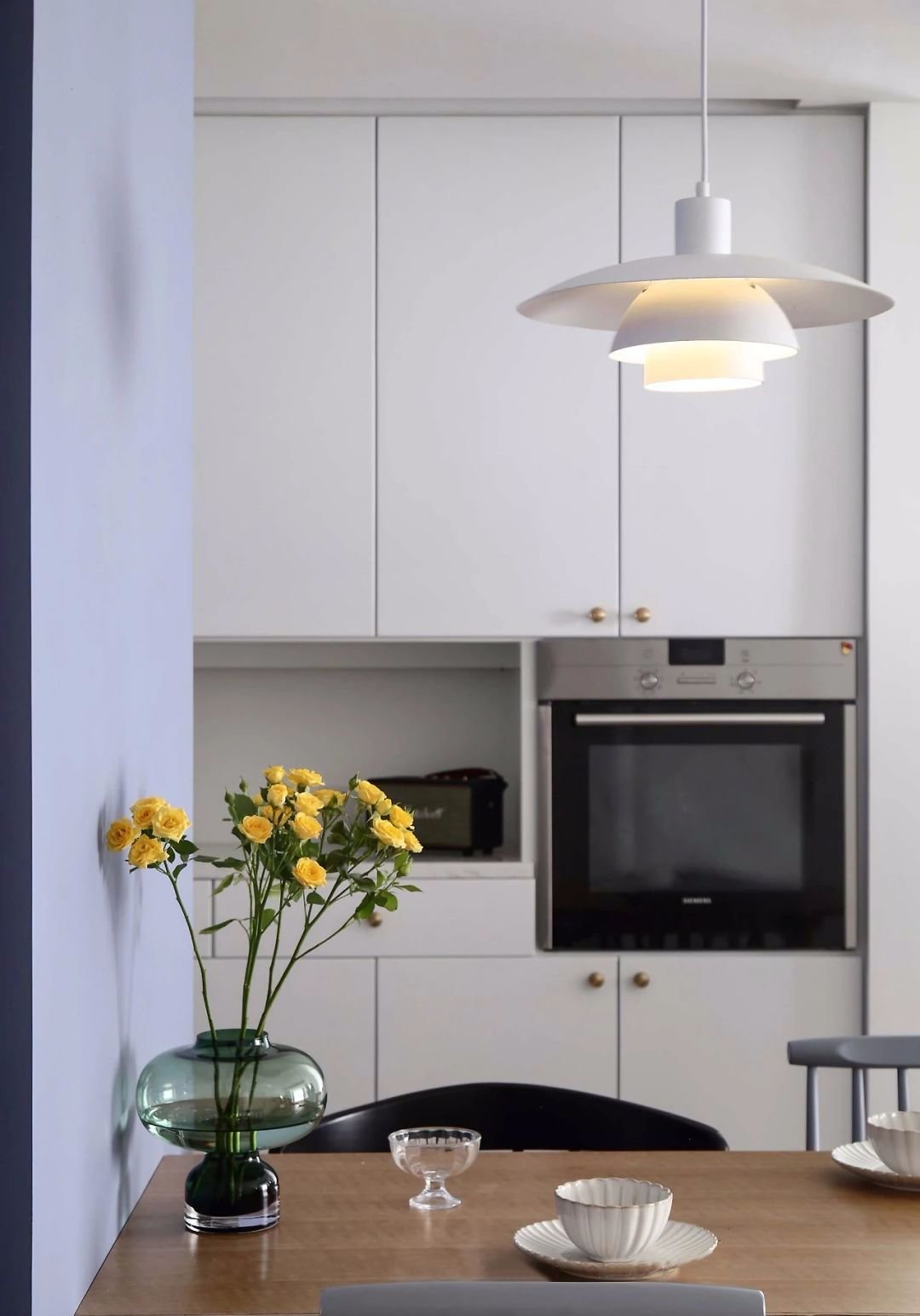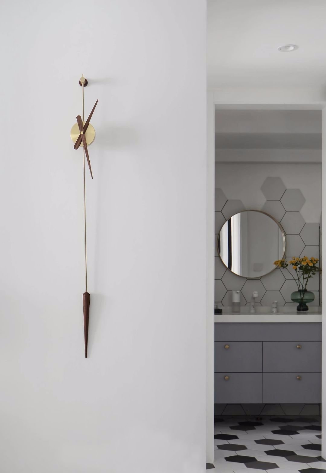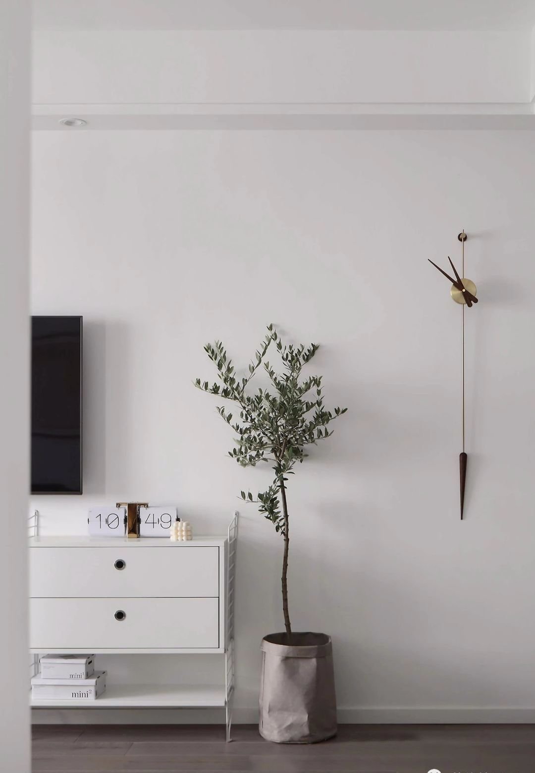 天然姿态的绿植与极简挂钟在白墙的映衬下,展现了功能性以外的美观。