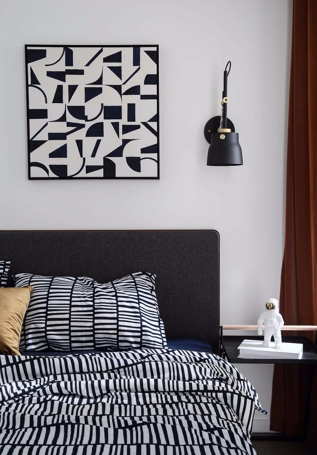 次卧,黑白的床品和装饰画让空间看起来更时尚大气,床头边几上的太空人摆件与整个空间一起生出艺术氛围。