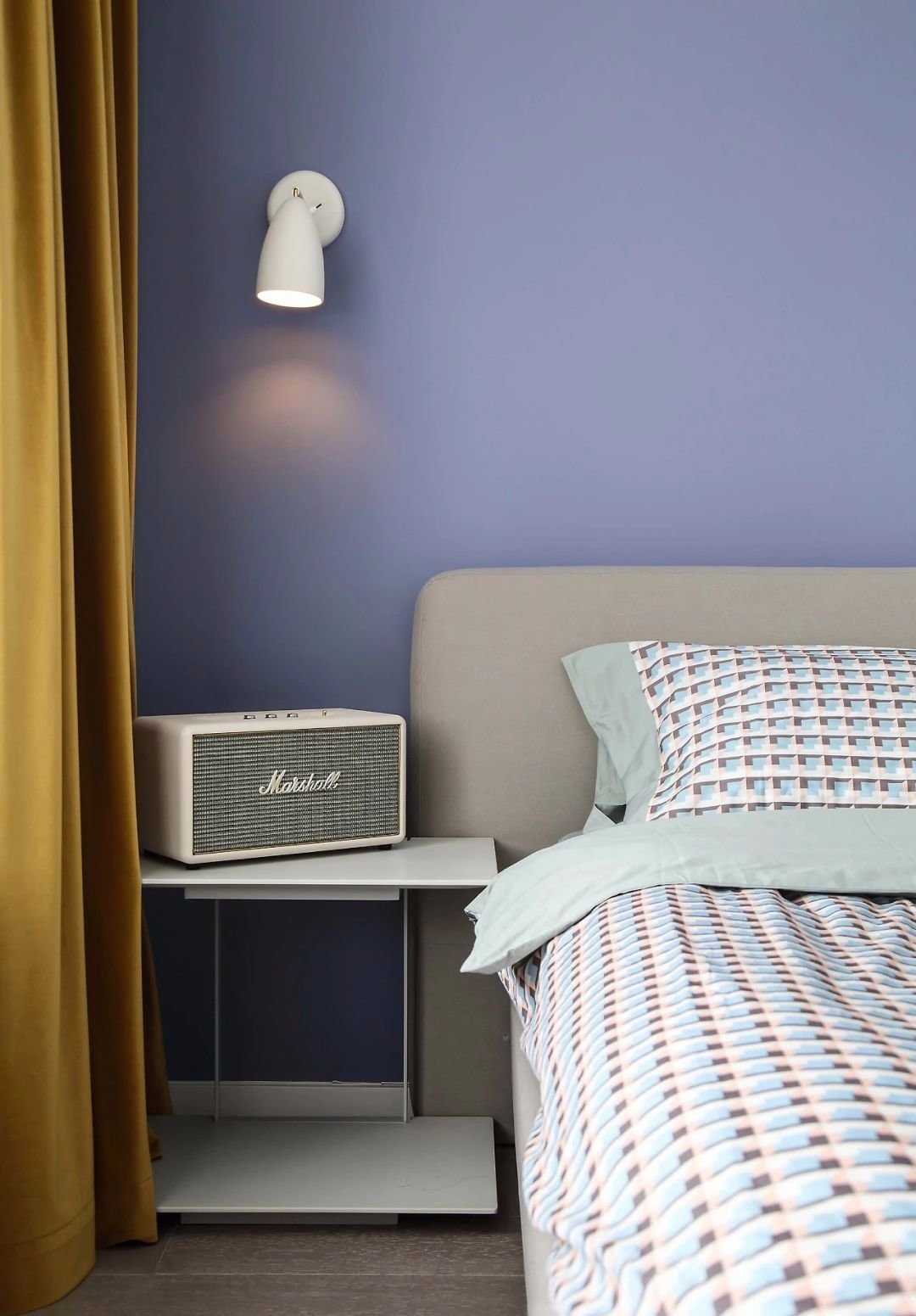 姜黄色的绒面窗帘融化蓝色的冷感,和颜值超高的音箱一起给主卧添上复古的韵味。