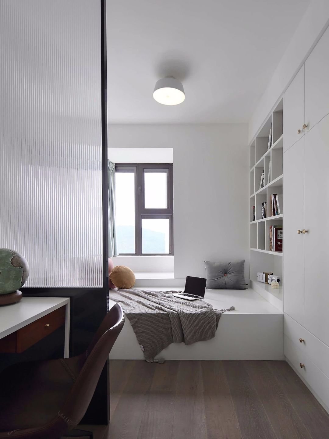 休闲区分为工作区和榻榻米两部分,采用长虹玻璃的半隔断进行分隔。榻榻米与收纳柜的整体定制,带来强大的储物功能,开放格便于书籍与收藏品的展示,实用性与颜值兼备。