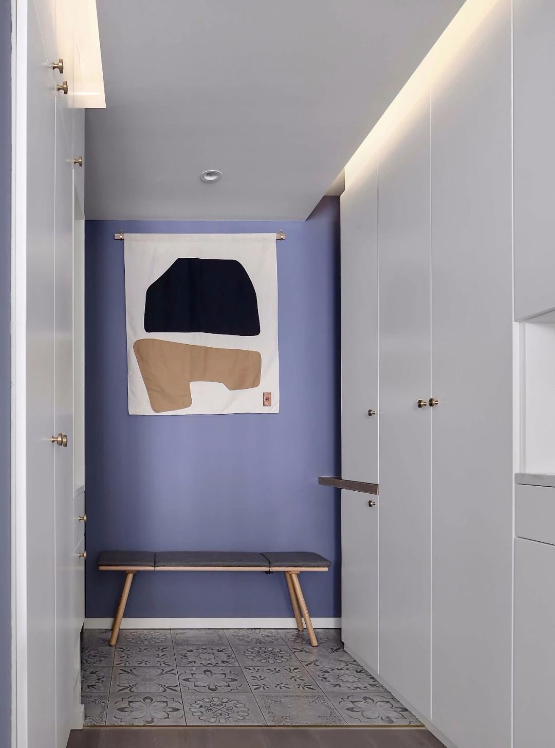 蓝紫色墙面搭配白色收纳柜带来满满的清爽感,玄关地面采用花砖铺贴,清新又优雅。