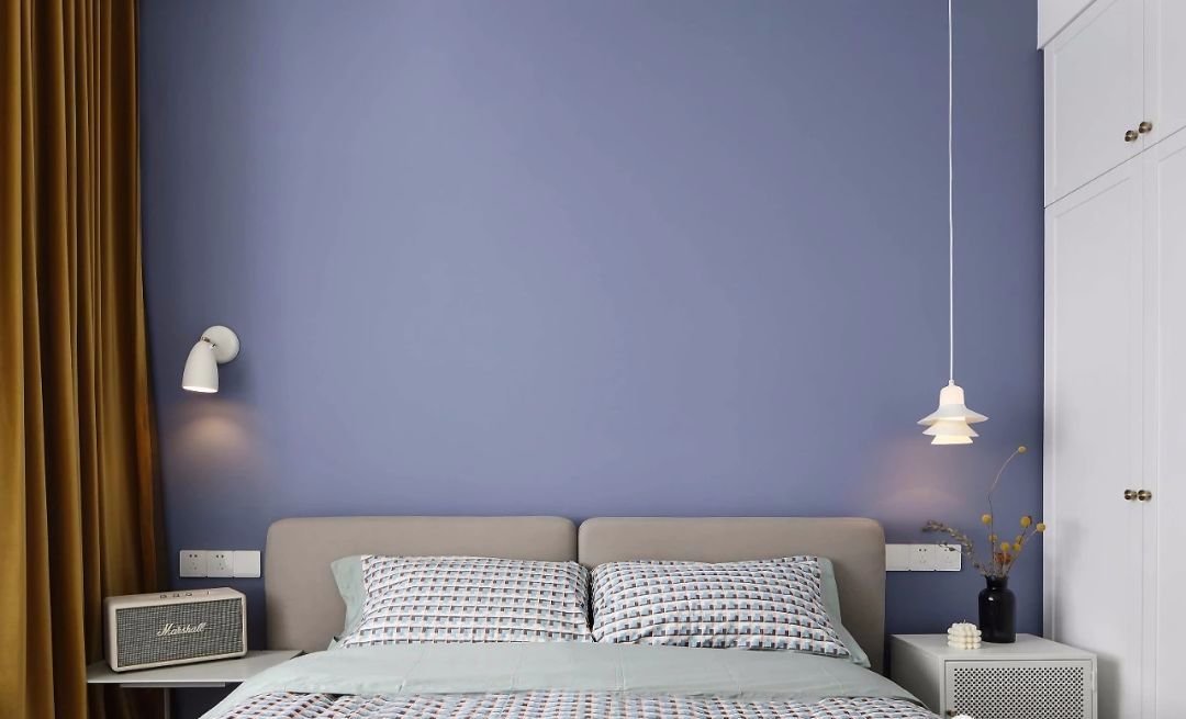 浅蓝色的床头背景揭开主卧的小北欧气质,床头两侧的不对称床头柜和不对称灯饰灵动有趣。