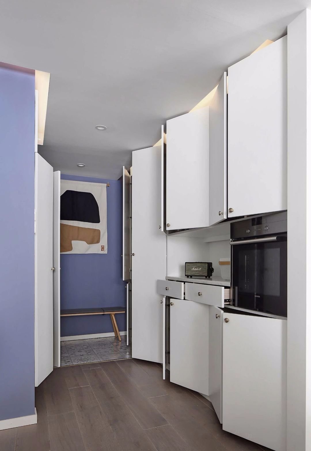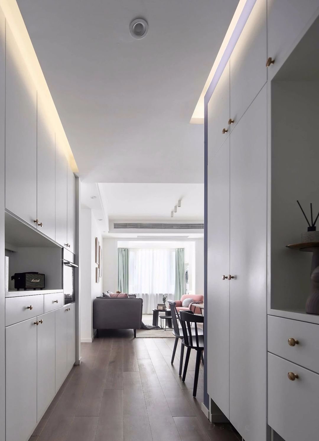 进门的过道两侧定制了大面积的白色到顶收纳柜,不同形状大小的柜体组合起来,不仅收纳空间充足,也方便物品分类,部分留空的设计增加玄关处的通透感。