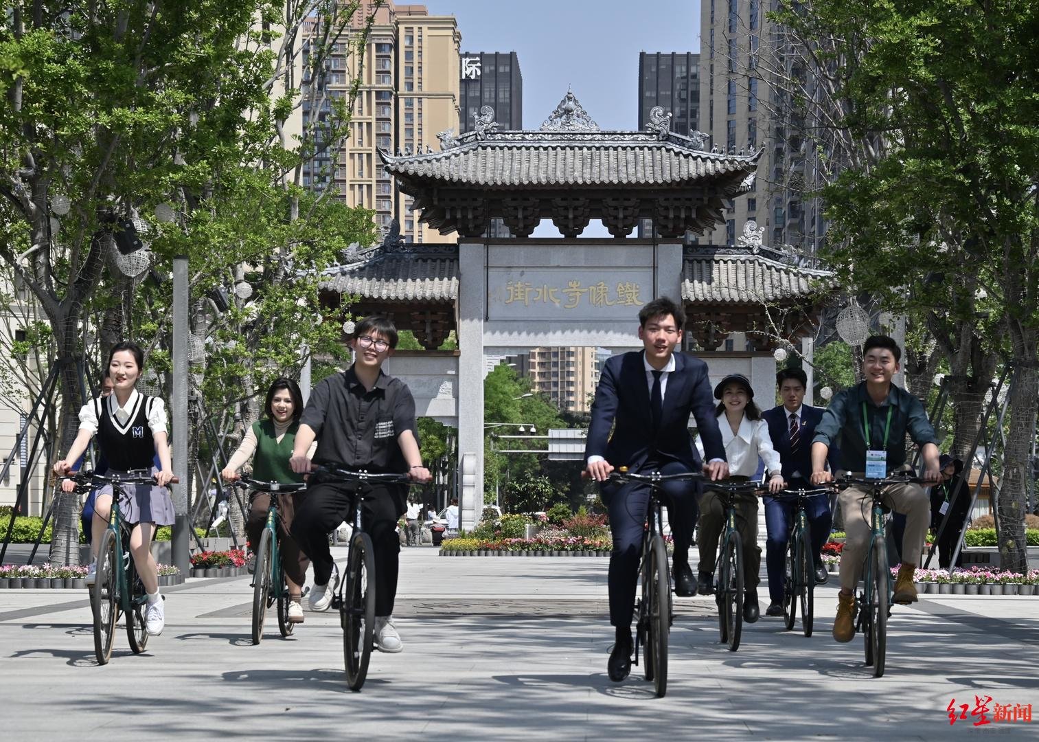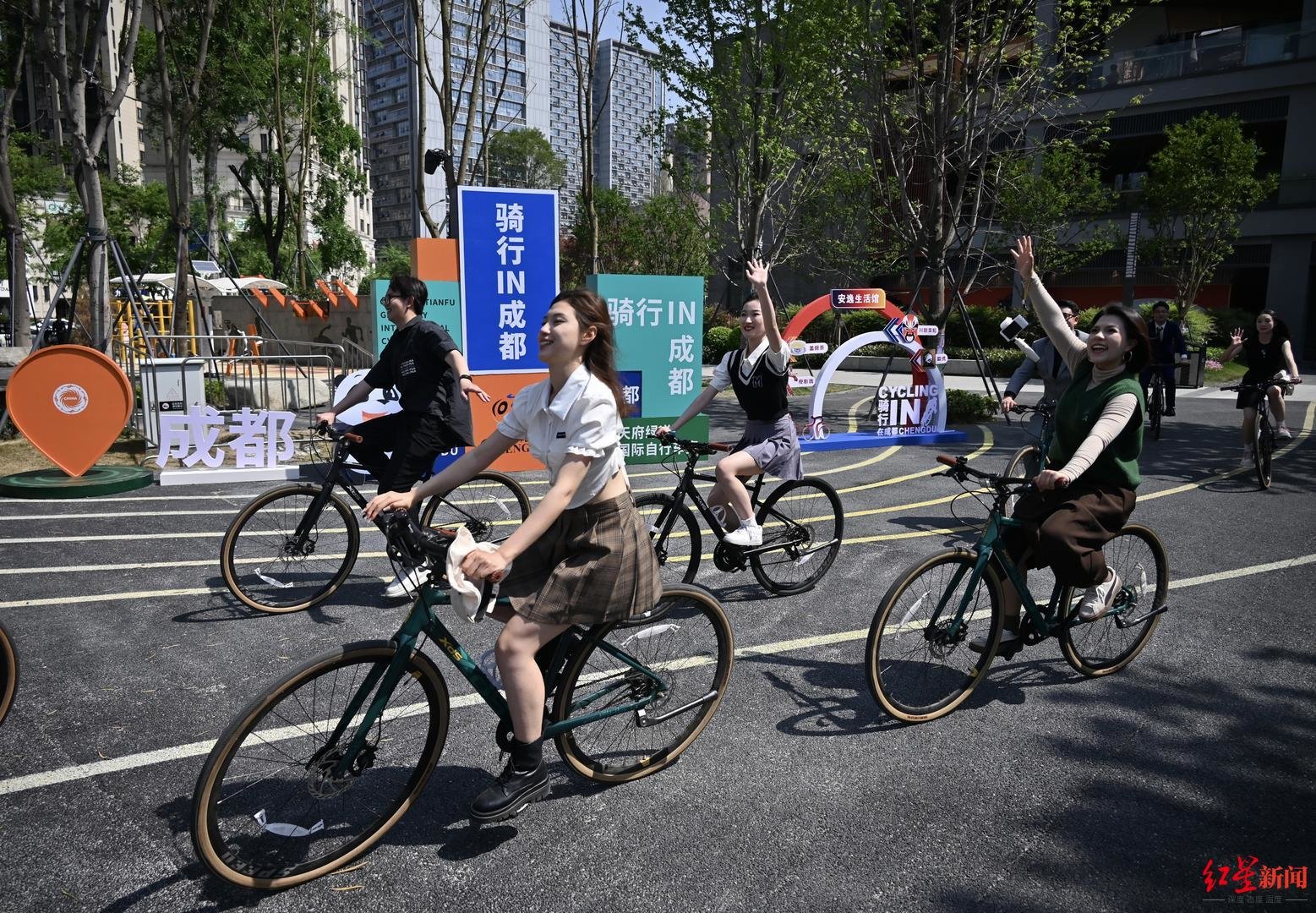 4月15日下午2点,在成都铁像寺水街二期运动广场,11个身着复古范儿的年轻人跨上复古自行车,沿着铁像寺水街向金融城“交子之环”复古骑行,途经双子塔、铁像寺水街、交子之环等“网红打卡点”。