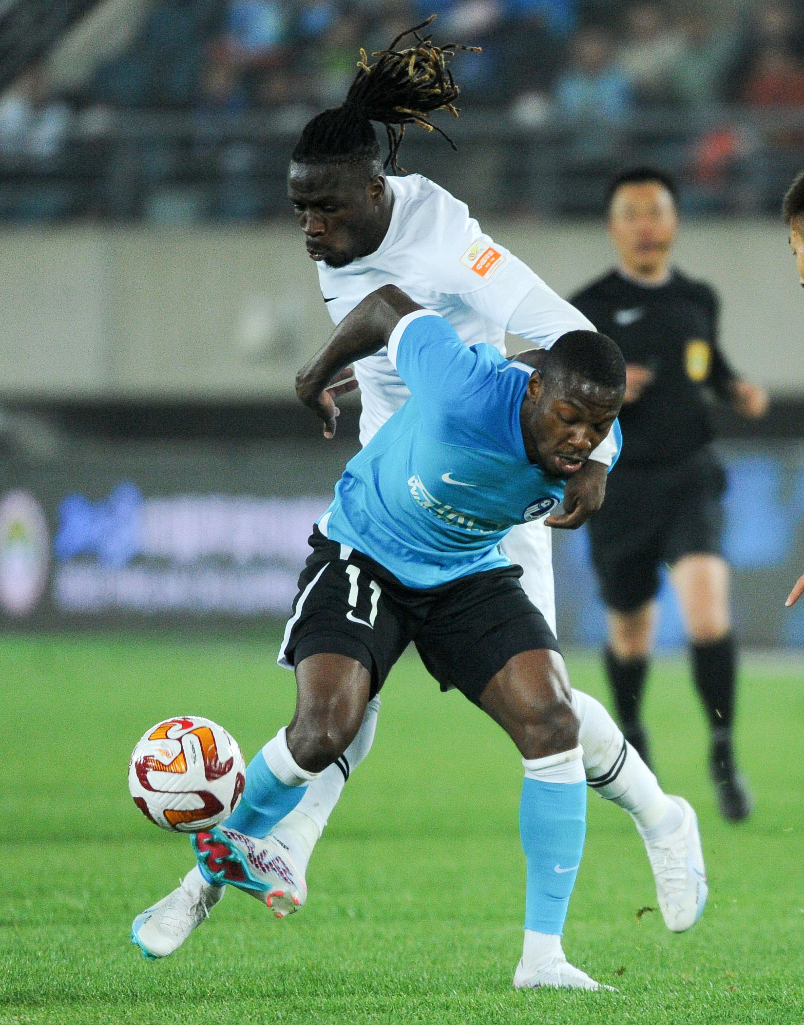 4月15日,大连人队球员曼巴(前)在比赛中与南通支云队球员巴尔德拼抢。新华社记者 龙雷 摄