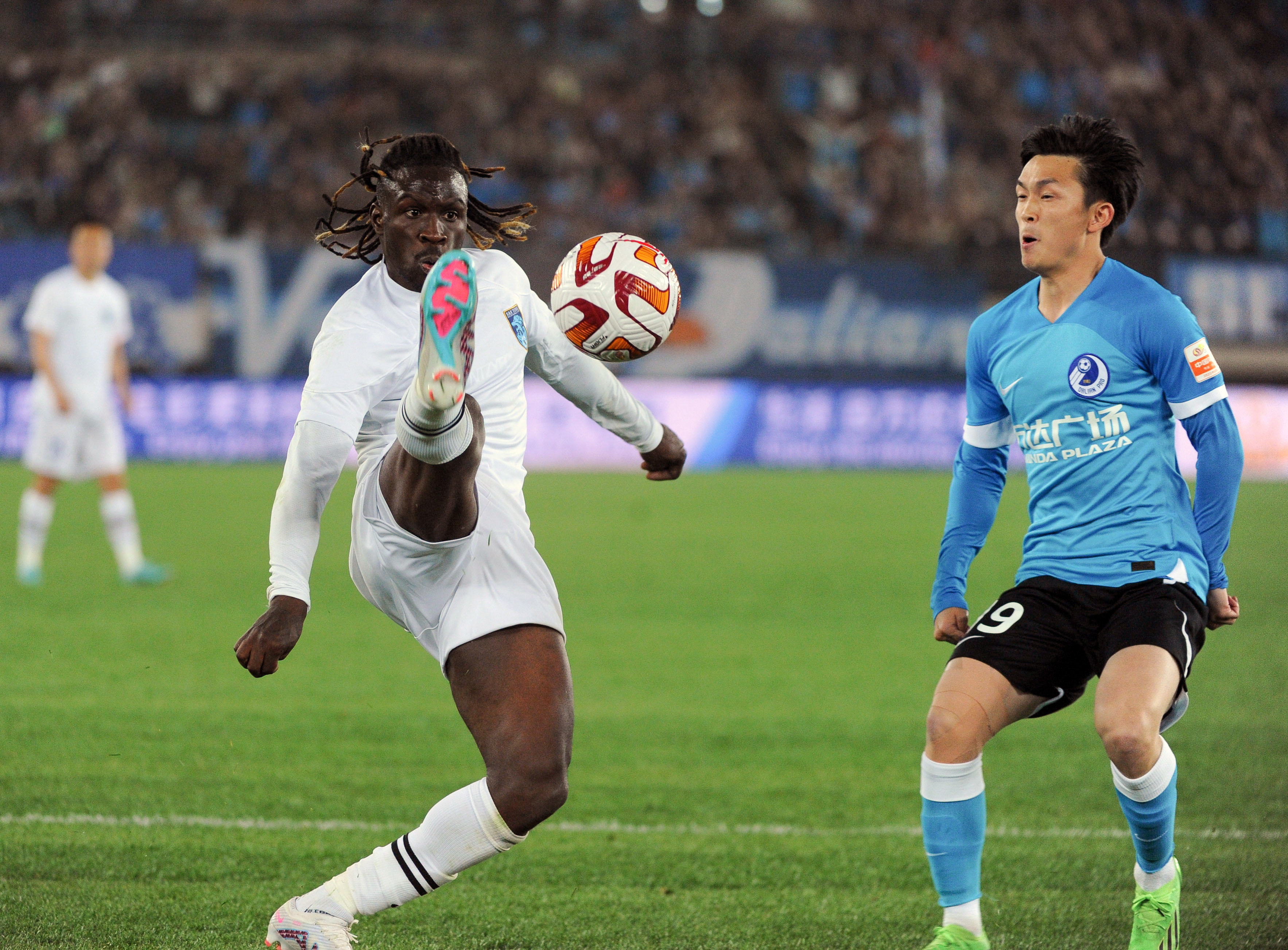 4月15日,大连人队球员吕鹏(右)在比赛中与南通支云队球员莫雷拉托(左前)拼抢。新华社记者 龙雷 摄