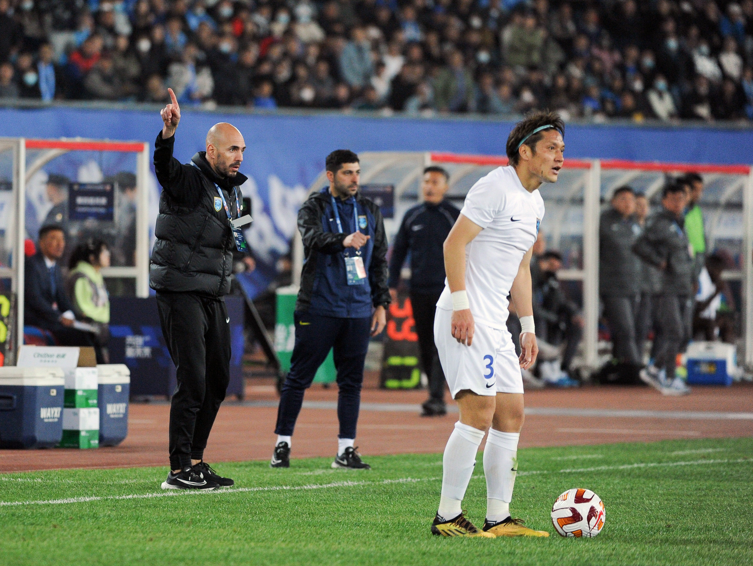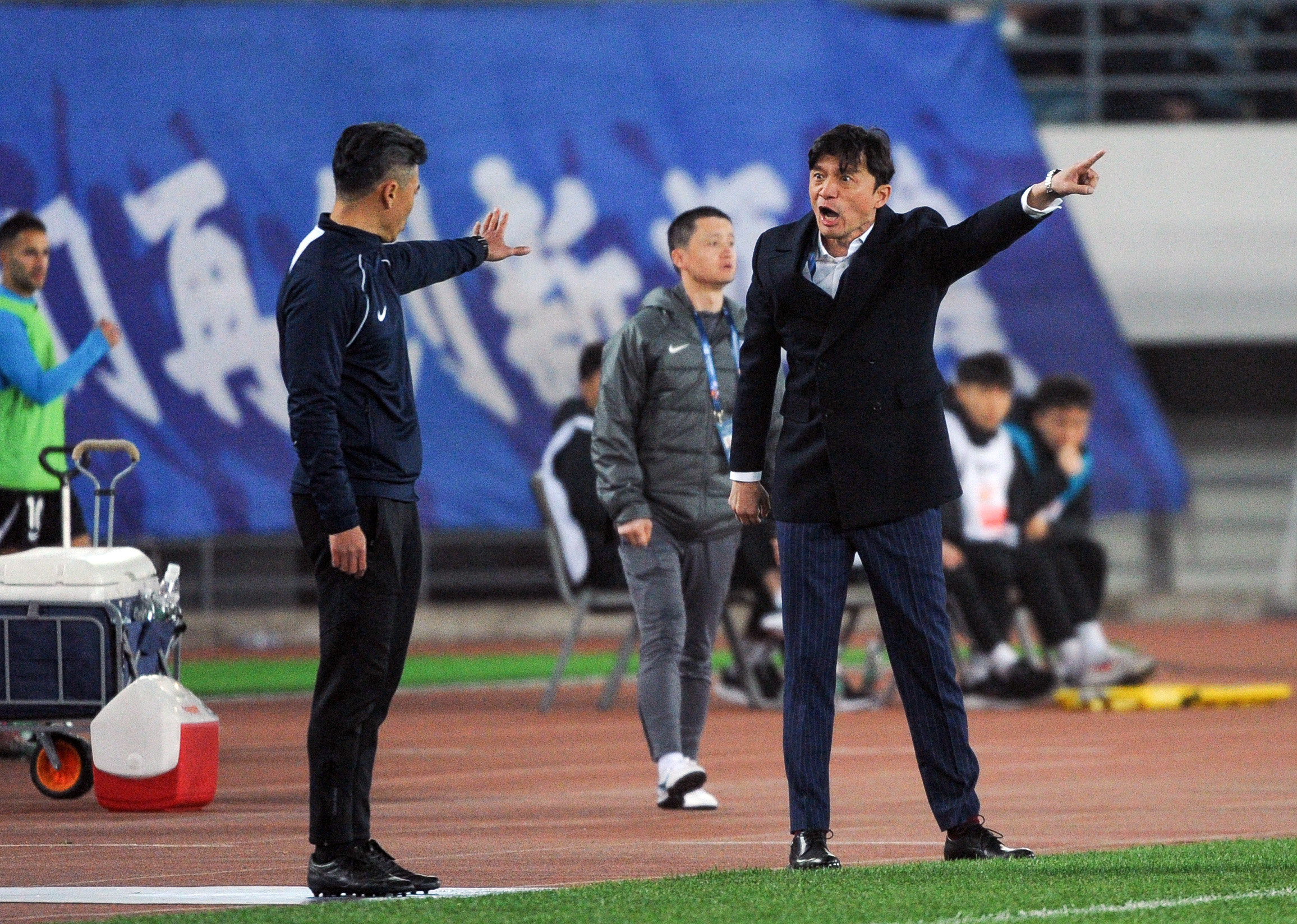 4月15日,南通支云队主教练帕特里西奥(左一)在场边指挥。新华社记者 龙雷 摄