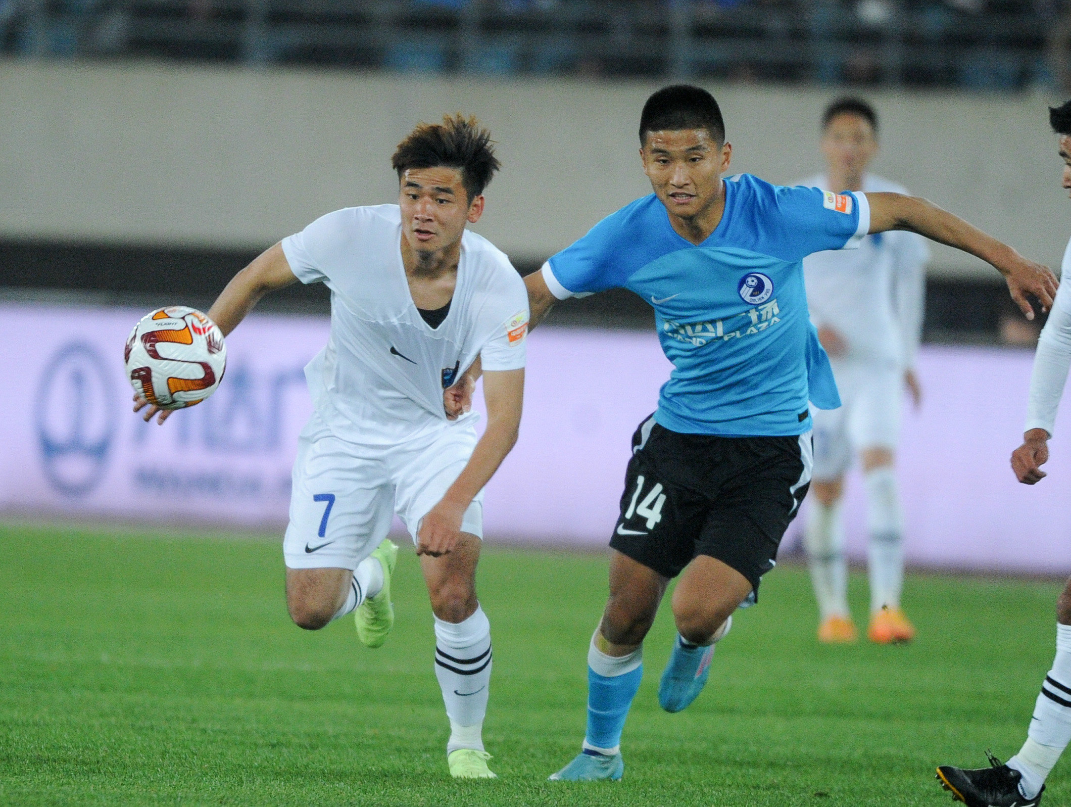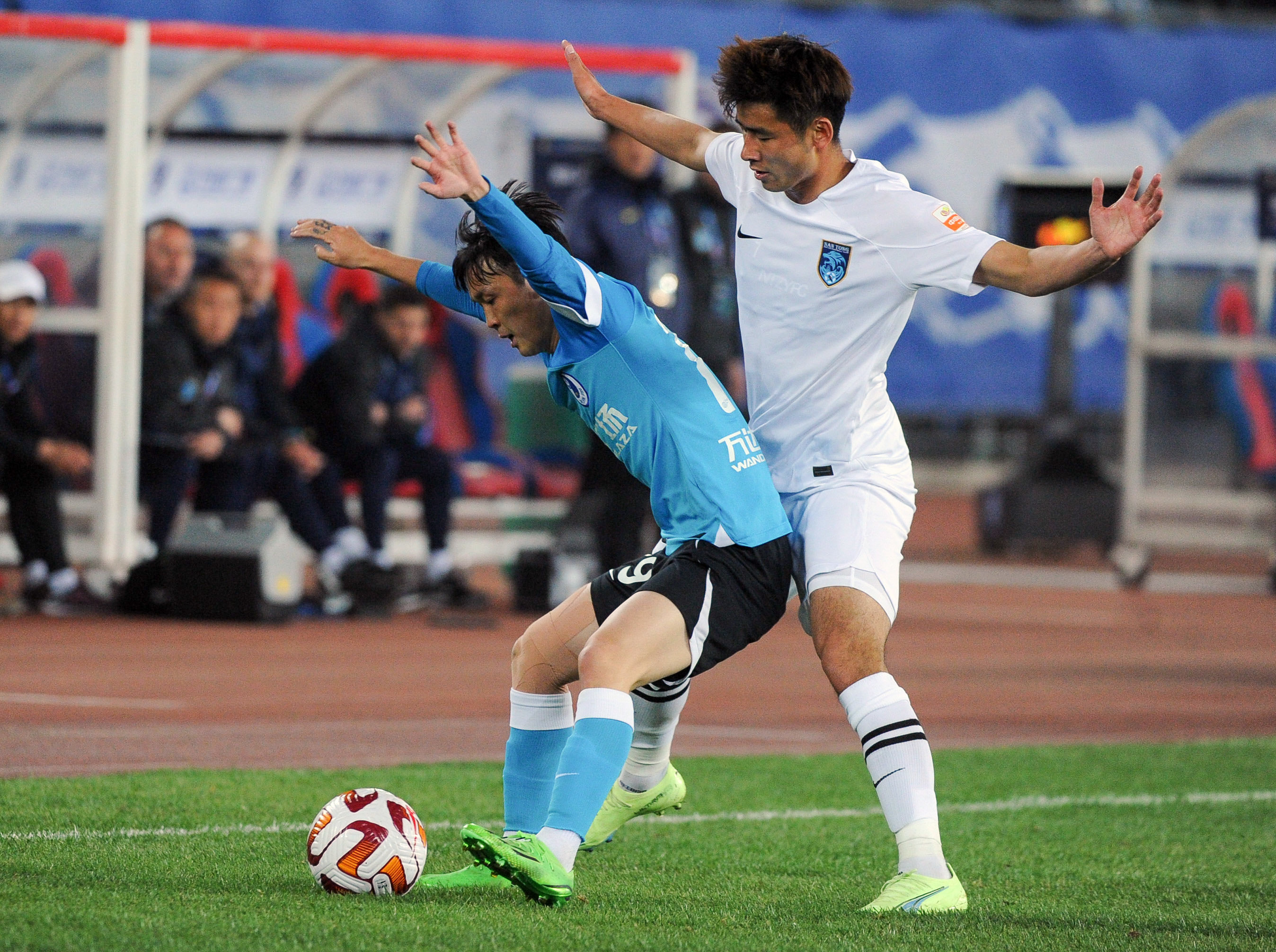 4月15日,大连人队球员王振澳(左)在比赛中拼抢。新华社记者 龙雷 摄