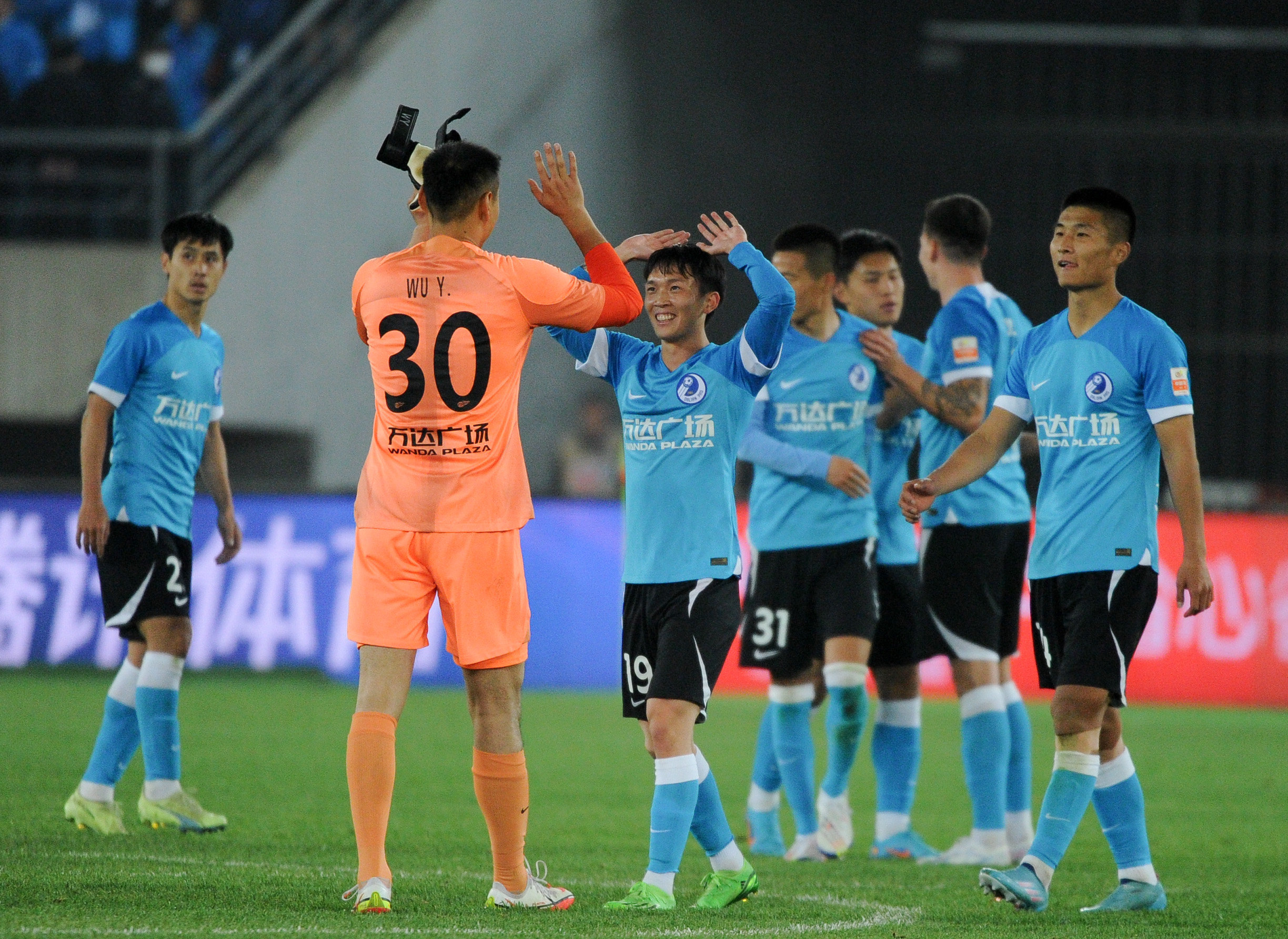 4月15日,大连人队球员庆祝比赛胜利。新华社记者 龙雷 摄