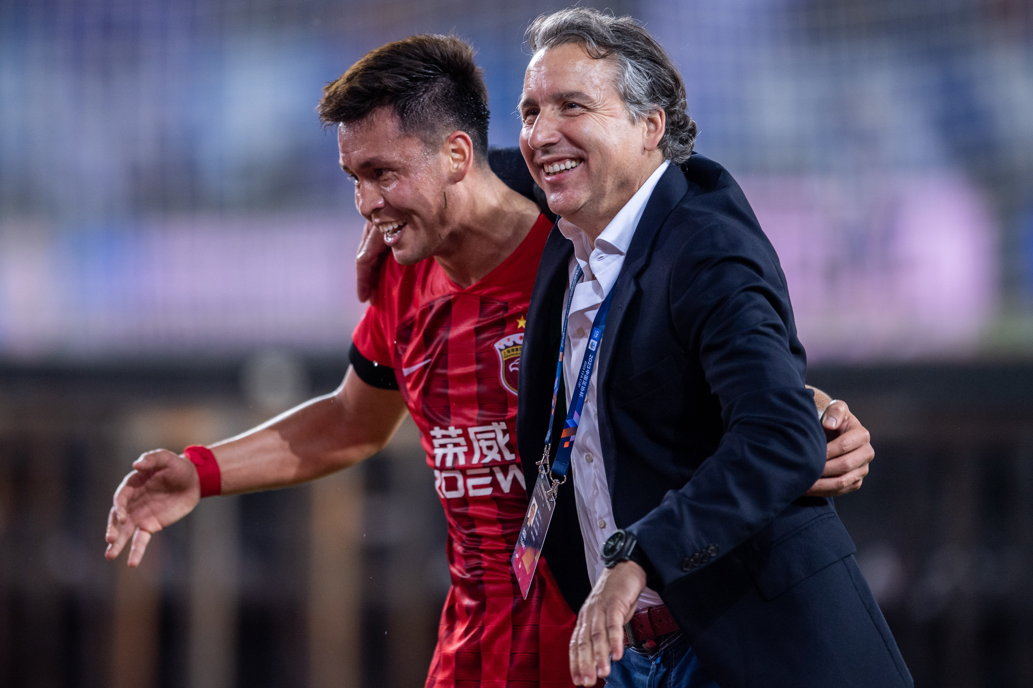 4月15日,上海海港队主教练哈维尔(右)在比赛结束后庆祝胜利。新华社记者 伍志尊 摄