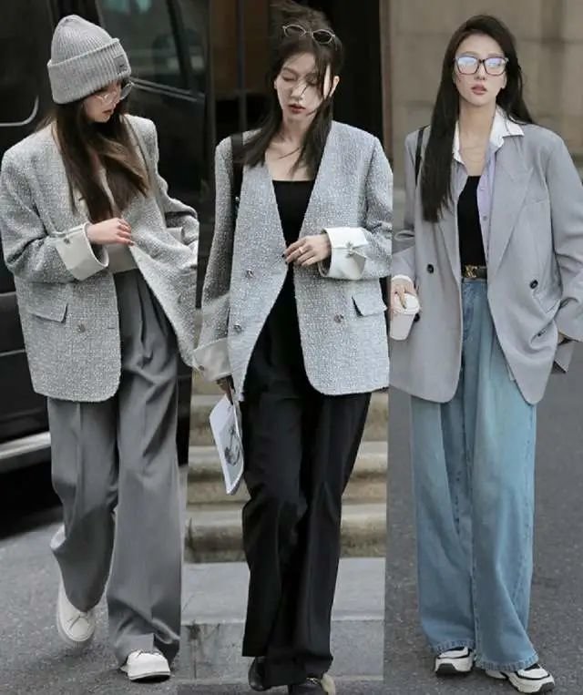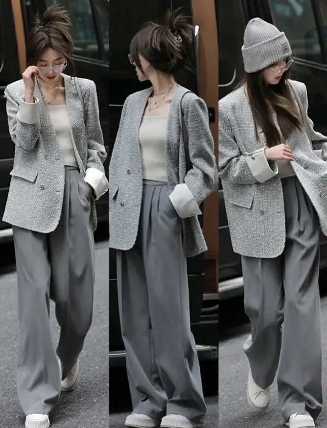 上班族们也可以尝试下灰色的阔腿裤搭配,上衣选择同色系的廓形西装,单一的配色往往可以轻松穿出高级质感,这样穿上班休闲都非常有范儿。