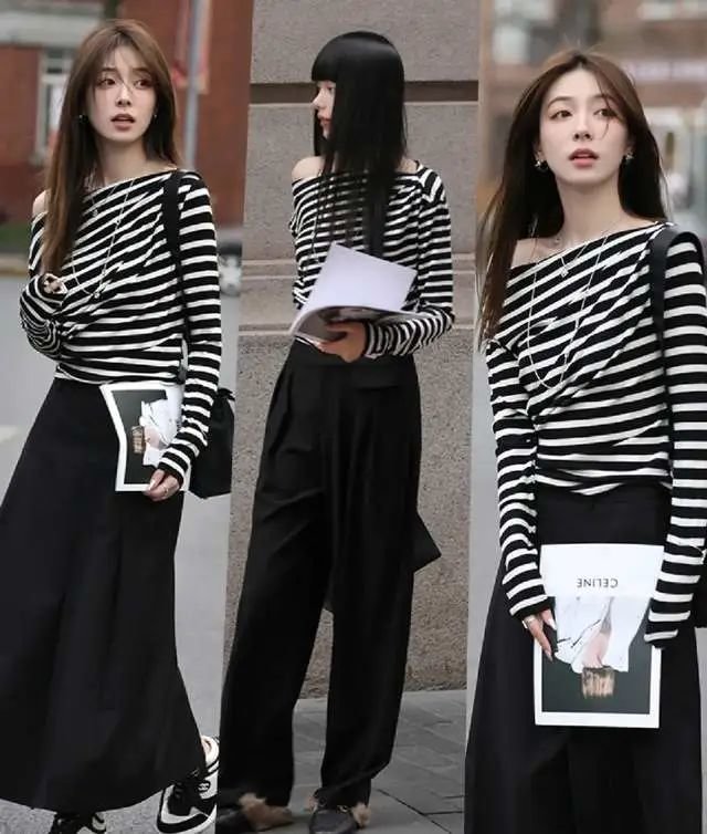 黑白条纹衫,一字领露出一侧香肩,既时尚又有些小性感,显白效果也好,搭配黑色的半身裙,优雅温柔的女人味,也可以搭配黑色阔腿裤,会变得酷一点,更时髦了。