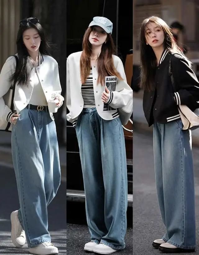 如果你觉得穿黑白有些显老气的话,那在春天可以准备一件帅气的棒球服,同样是黑白色,但是款式却给人一种青春的活力感,尤其是短款,对于个小子女生也格外友好,搭配拖地阔腿裤,分分钟穿出大长腿。