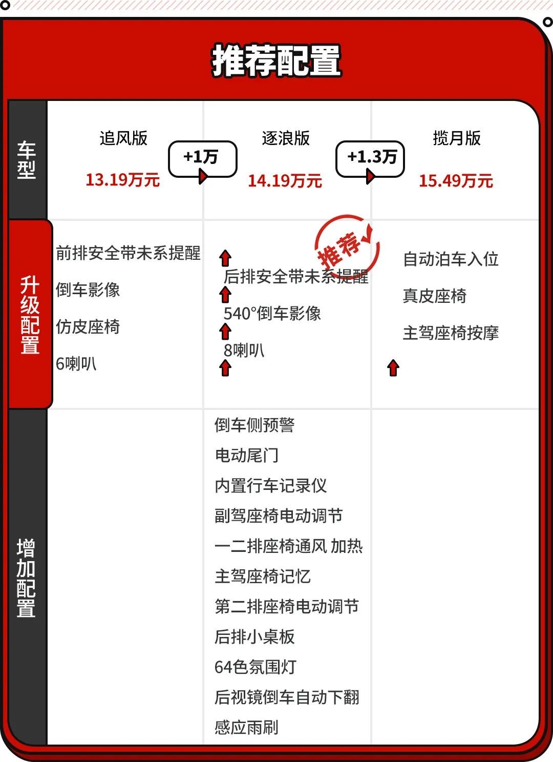 教授推荐14.19万元的逐浪版,其比追风版贵了1万元,但配置明显增加了很多,性价比最高。