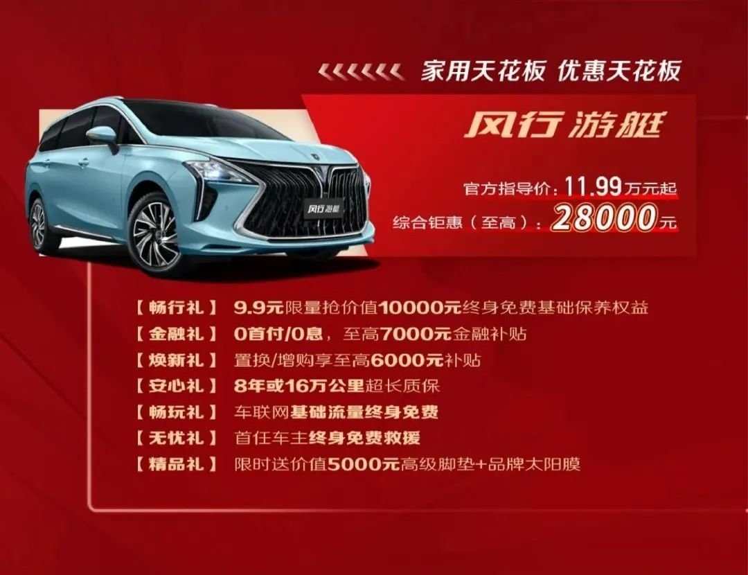而东风风行在近日推出的限时优惠政策中,宣称游艇的综合优惠至高能达到2.8万元,截止日期未知。