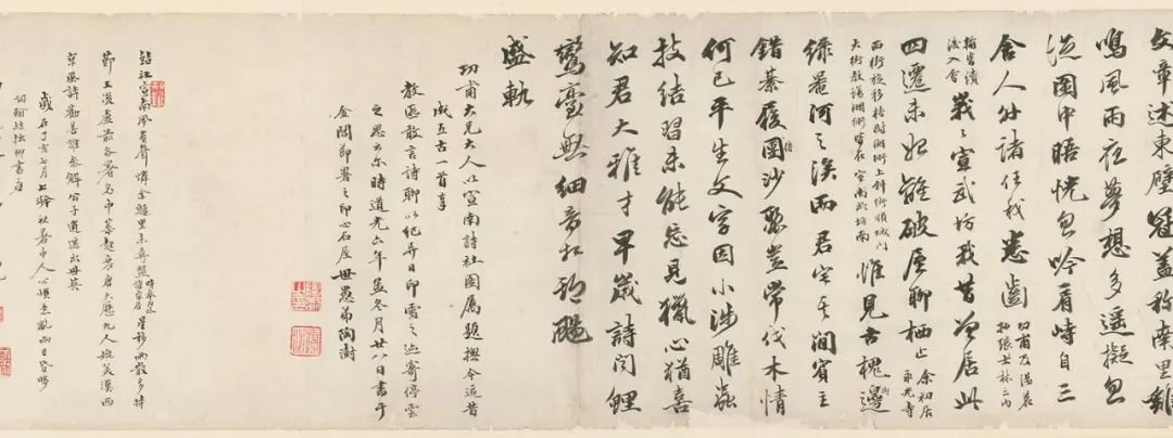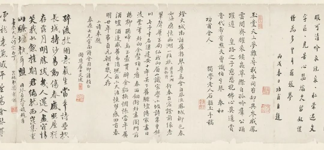 作为画卷的中心人物,潘曾沂自己也有题跋“独携冰雪趁幽寻,难得苍苔共此岑。车马往来无熟路,国家闲暇可清吟。衣冠衮衮私荣遇,文字区区见苦心。瑟缩久留奴仆怪,为多里耳罢张琴。丙戌春日,功甫自题”,钤朱文方印“潘曾沂印”和“功父新诗”。潘曾沂的自题书于道光六年(1826),是此画完成之后的第3年。所谓“衣冠衮衮私荣遇,文字区区见苦心”,正是潘曾沂与题跋者寅谊、乡谊与学谊的概括。而多年以后,昔日一起雅集与文会的伙伴多已“风流云散”,有的甚至天人相隔,陶澍写下了“宣南诗会几经春,短烛深杯记旧因。惆怅瑶谿好风景,不容长啸着斯人”的感喟。但无论沧海如何变成桑田,宣南诗社曾经在京城的“文章述东壁,冠盖称南里”的盛景,却有赖于《宣南诗会图》在历史长河中得以定格,并传之恒远。(注释从略 详参纸媒)