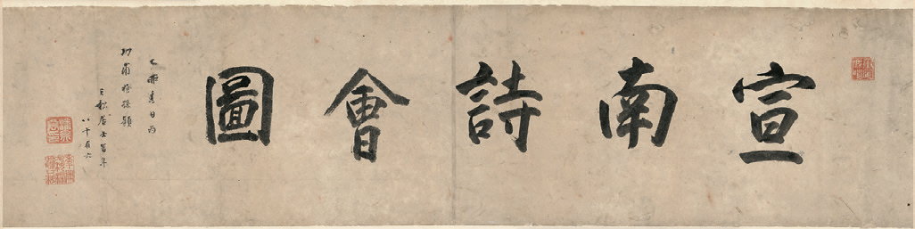 王学浩在画心题识曰:“宣南诗会图,甲申仲冬中澣呵冻为功甫词兄画于山南老屋之易画轩,椒畦王学浩”,钤朱文方印“椒畦”、白朱文相间印“王学浩印”和朱文椭圆印“鸿爪”。“功甫词兄”为潘曾沂(1792—1852),原名遵沂,字企曾,号功甫、春泉、瑟庵、小浮山人等,收藏家潘世恩(1769—1854)之子,江苏吴县人,清嘉庆二十一年(1816)举人,先后担任内阁中书和国史馆分校等,擅诗文,富藏古籍文献,著有《功甫小集》《吴门表隐》《开元寺志》《丰豫庄本书》《东津馆文集》和《闭门集》等。此画作于道光四年(1824),时年王学浩71岁,潘曾沂33岁。“易画轩”乃王学浩斋名,在江苏昆山,因“尝为人作画十幅,其人即为筑精舍三楹以报之”,故名“易画轩”。