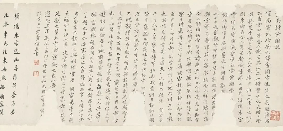 宣南诗会图记。宣南,宣武坊南也。诗会图者,述交也。吴县潘君功甫官中书舍人,僦居其地,而一时贤士大夫偕之宴游,于是乎识之也。会以九人为率(月推一人主之也),记人则东乡吴舍人嵩梁、新城陈学士用光、泾县朱宫赞珔、长乐梁观察章钜、宜黄谢学士阶树、嘉兴钱侍御仪吉、吴县董太守国华、歙县程侍讲恩泽也。壬午长乐观察守楚中,癸未歙县侍讲典黔试,泾县宫赞乞养归,益以华亭张舍人祥河、临川汤舍人储璠、侯官李侍读彦章,仍九人也。先是与斯会者,有安化陶中丞澍、泾县胡廉访承珙、祥符周观察之琦、嘉善黄太守安涛、侯官林廉访则徐,而功甫以辛巳(四月)入都,皆官于外,不列九人之数也。绶惟京师首善之区,天下人才(材)所辐辏,国家承平日久,士大夫褒衣博带,雅歌投壶,相与扬翊休明,发皇藻翰,不独艺林之佳话,抑亦熙化之盛轨也。而诸君又皆能以风雅之才,求康济之学。今之官于外者,莫不沉毅阔达,卓卓然有所表见(异于时),则足信斯会之不凡,而功甫之取友为不可及已。绶穷巷下士,目未睹皇都之壮丽,未尝与并世贤豪长者通缟纻,得与功甫游,稍稍闻诸君之概(前侯官廉访莅苏,一入其幕,静乐观察通存问而已,其人君子也。诸君之为人可一二想也)。方今海宇晏安,人民静谧,而事之待理者渐多,坐言而起行之兴利除害,为国家万年有道之福,则不仅以区区文字夸交际,而一时聚散之无足感也(董太守,绶旧识也,盖以吾□□□□□。道光五年岁次乙酉四月望后,元和朱绶仲环甫识于䱐溪上交芦馆并书)。