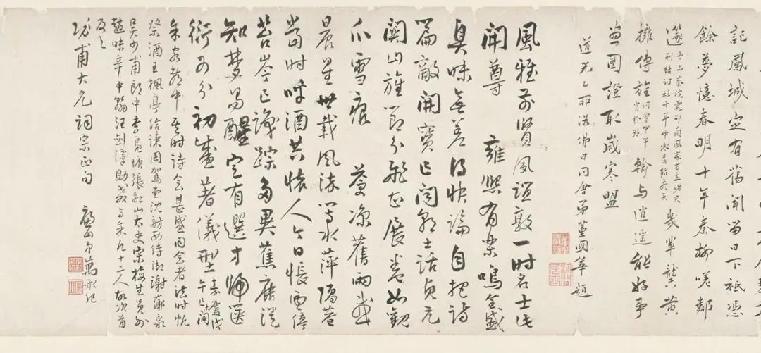 潘曾沂是《宣南诗会图》卷的艺术赞助人,也是画卷题跋的邀集者。这些题跋断断续续作于道光五年(1825)至道光七年(1827)间,分别以现场挥毫或邮寄的形式倩人书写。他以这种其时最为流行的诗画题跋形式,构建了一个诗与画的交游网络。画中的故事发生地北京是当时的政治和文化中心,冠盖云集,文风鼎盛。而题跋的多数成员多为苏州人或流寓苏州,苏州又是其时诗文书画最为兴盛的江南重镇。正因如此,以画家王学浩、诗人兼鉴藏家潘曾沂,以及诸多士大夫参与的《宣南诗会图》,便成为清代乾嘉时期文人风尚的缩影。