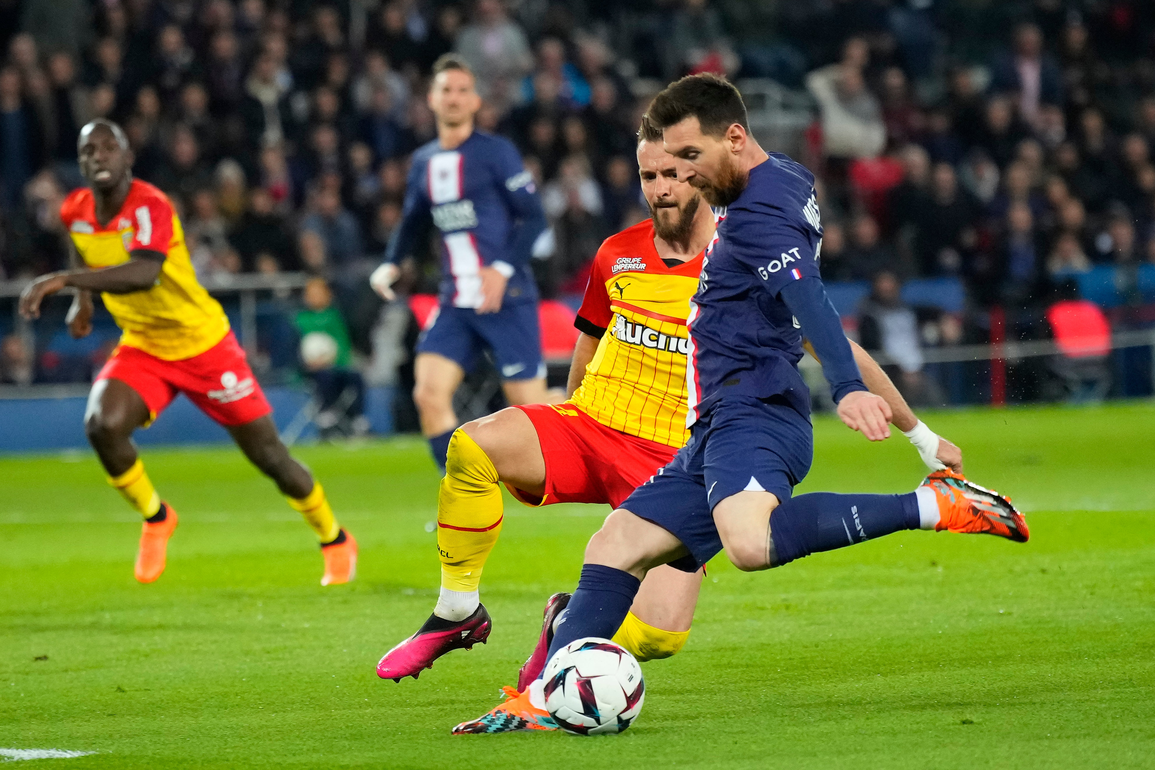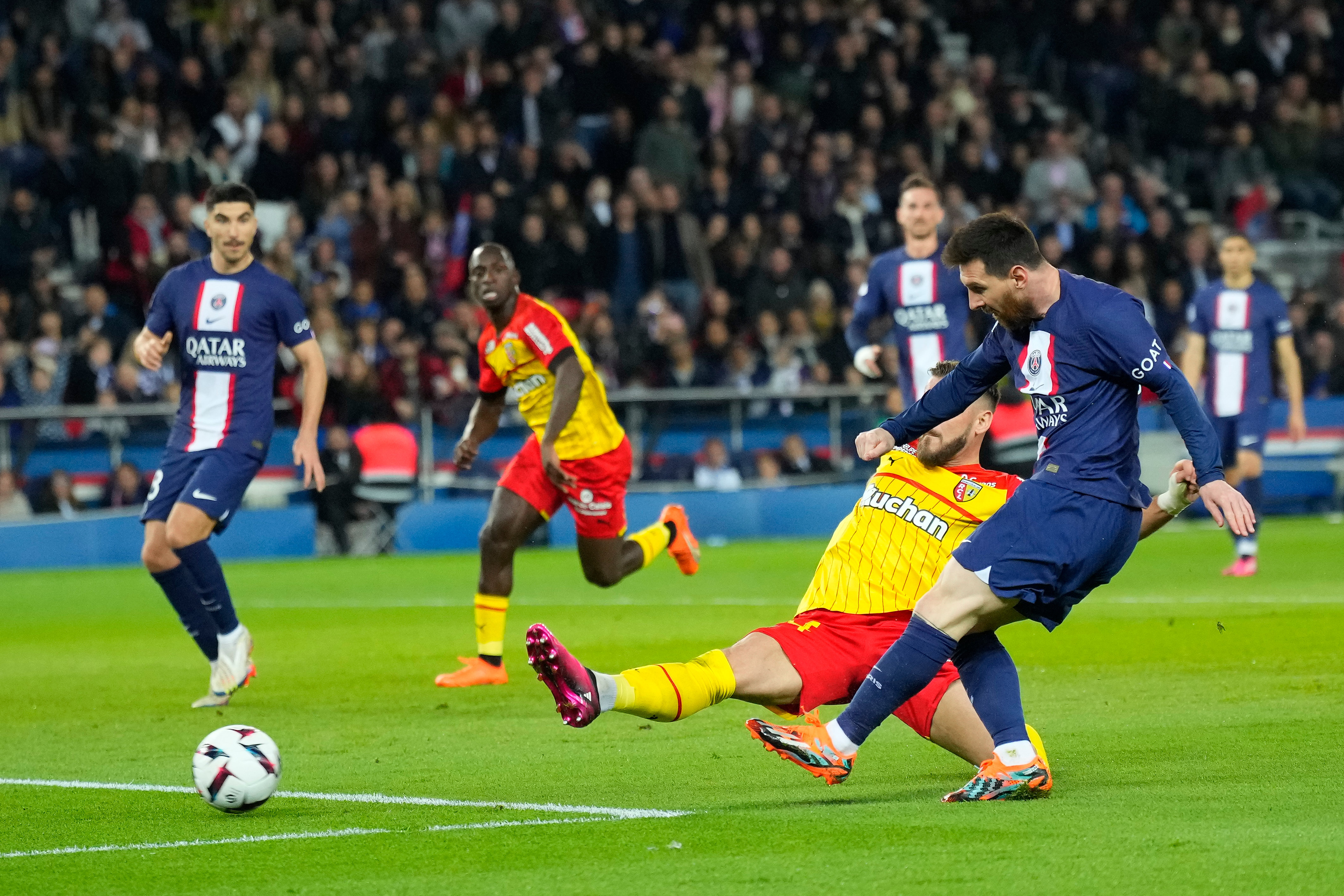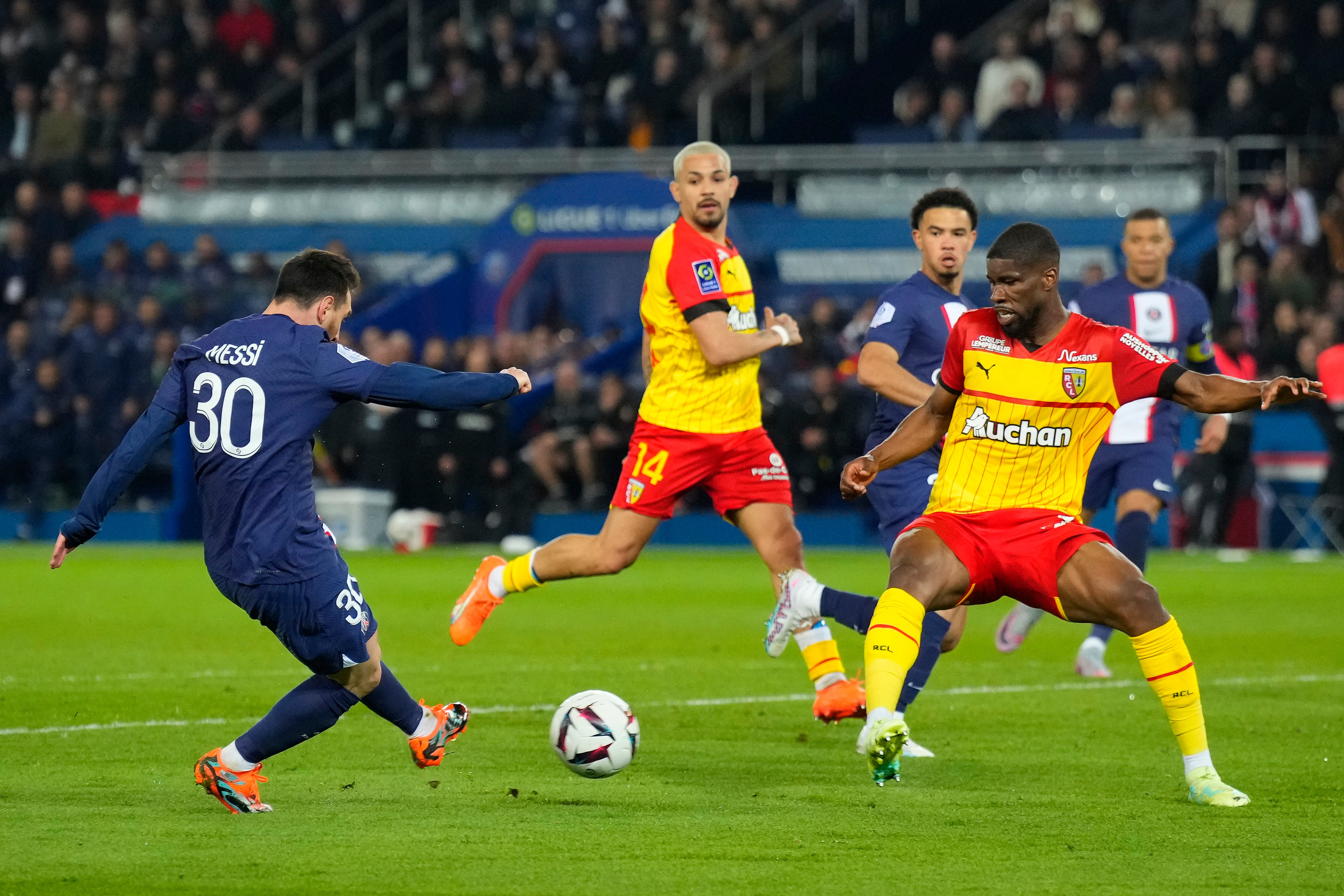 4月15日,巴黎圣日耳曼队球员梅西(前右一)在比赛中射门得分。 新华社发(戈兰·热尔沃摄)