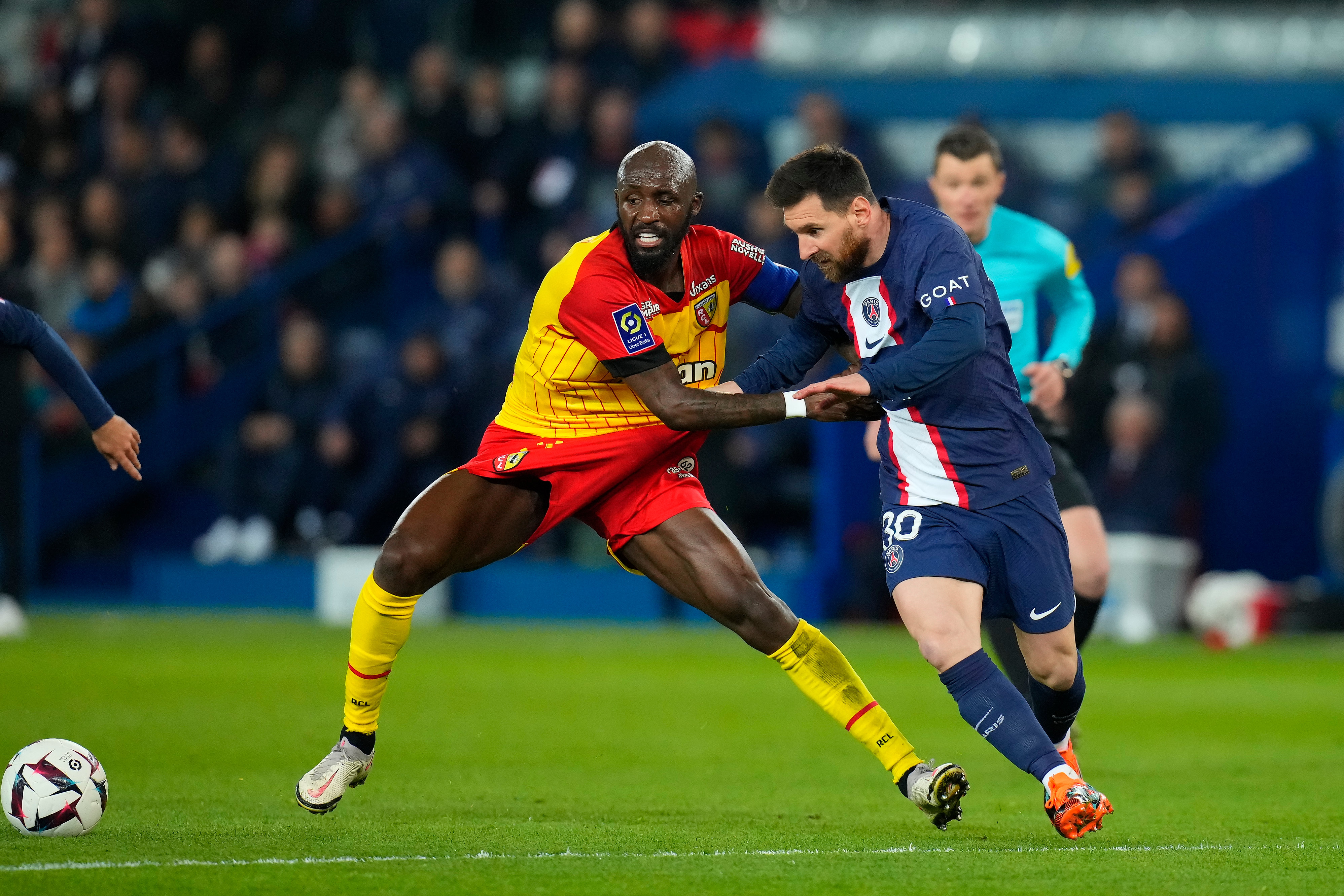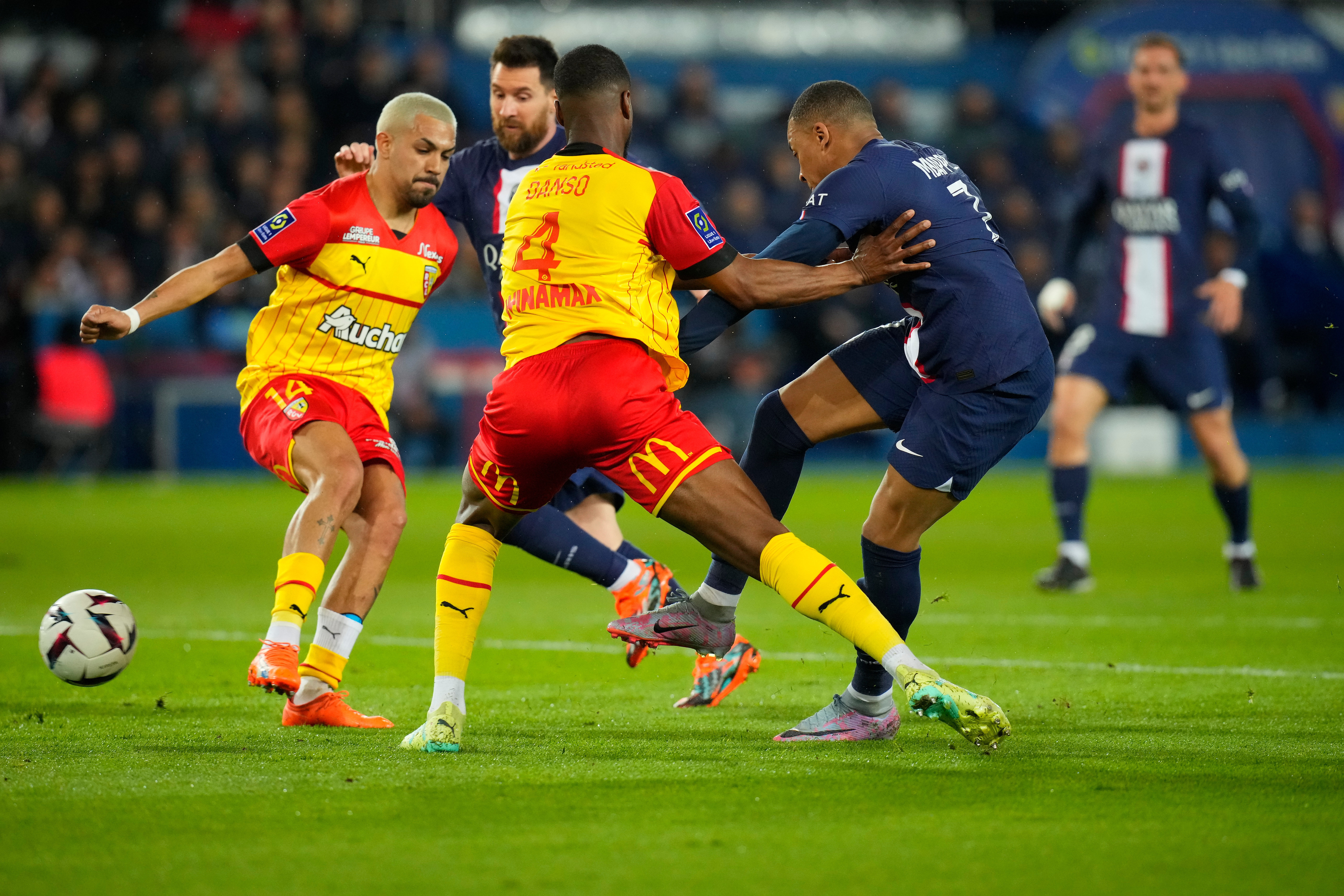 4月15日,巴黎圣日耳曼队球员梅西(左一)在比赛中。 新华社发(戈兰·热尔沃摄)
