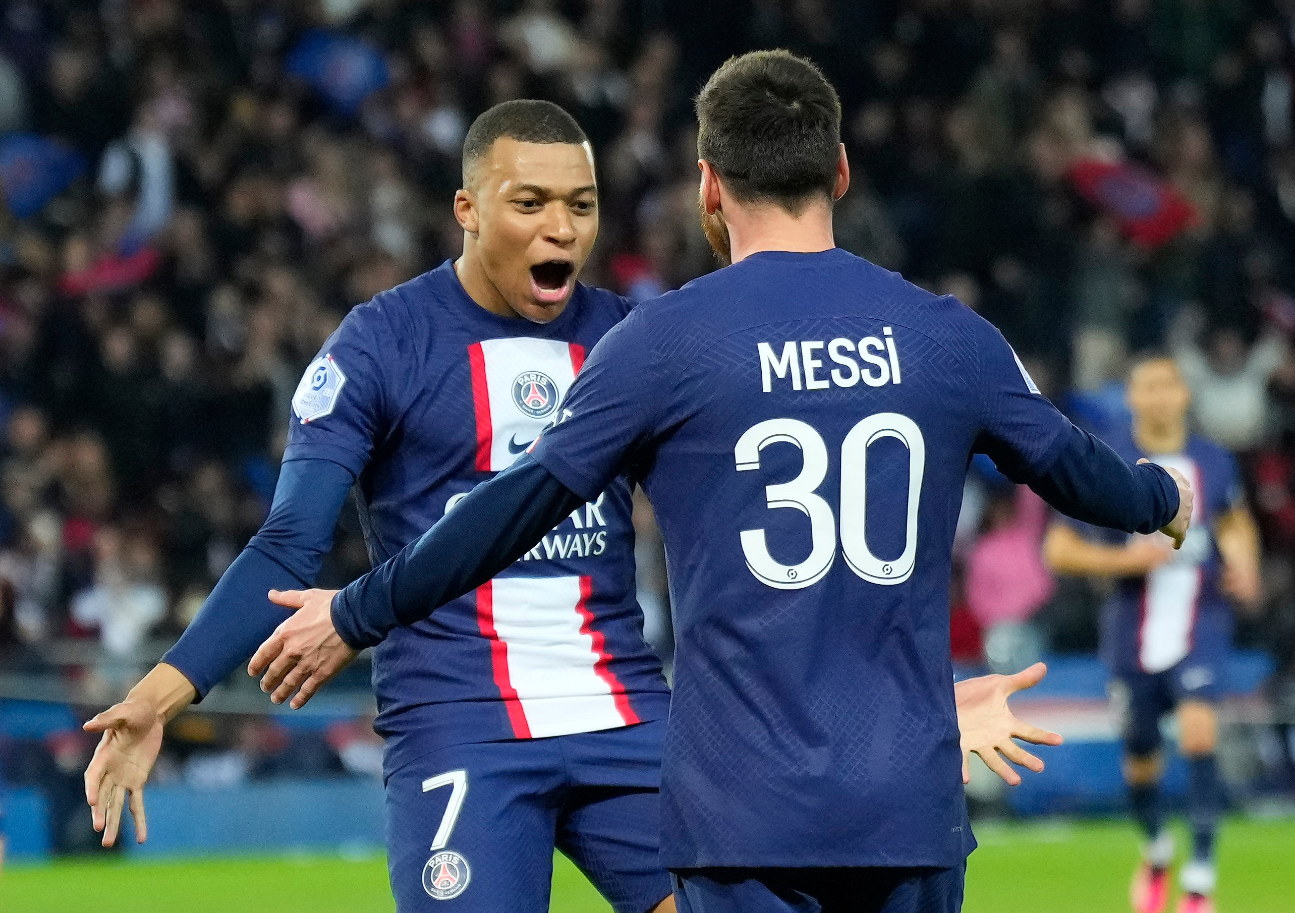 4月15日,巴黎圣日耳曼队球员姆巴佩(左)和梅西庆祝进球。 新华社发(戈兰·热尔沃摄)