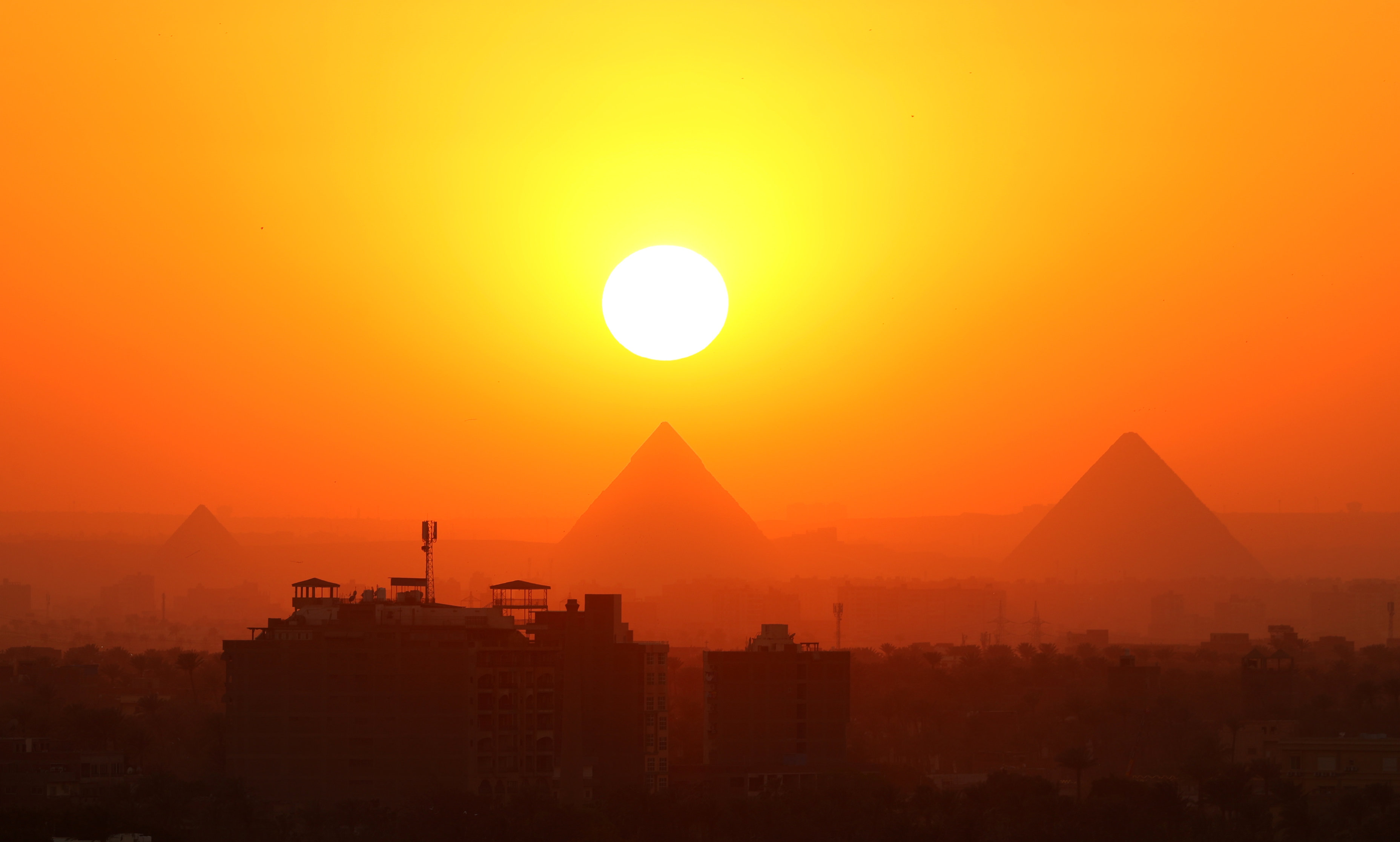 这是4月15日在埃及开罗拍摄的吉萨金字塔群日落景色。新华社记者 隋先凯 摄