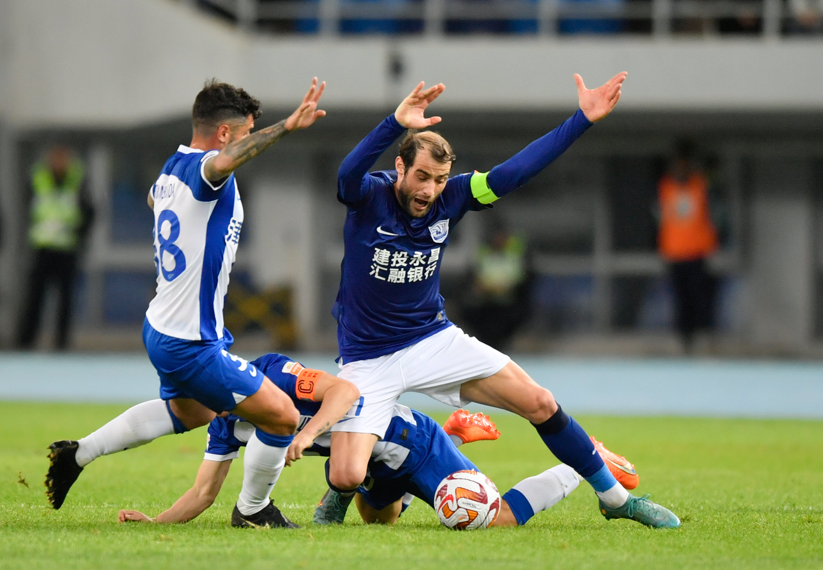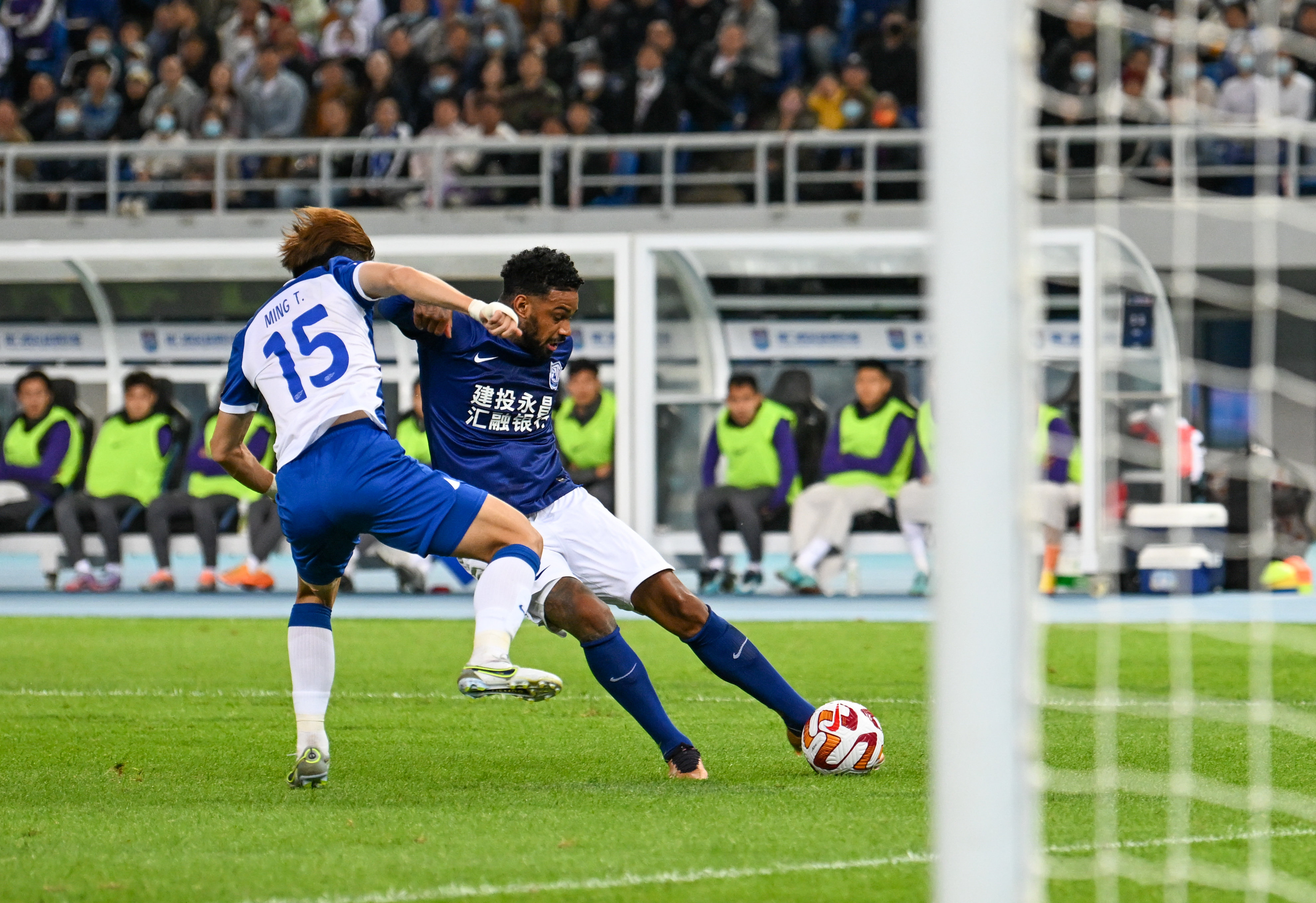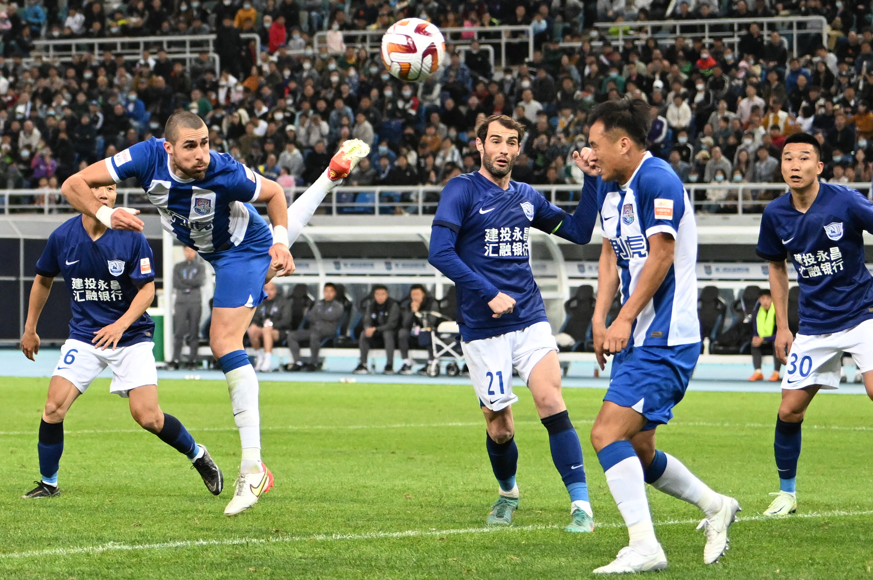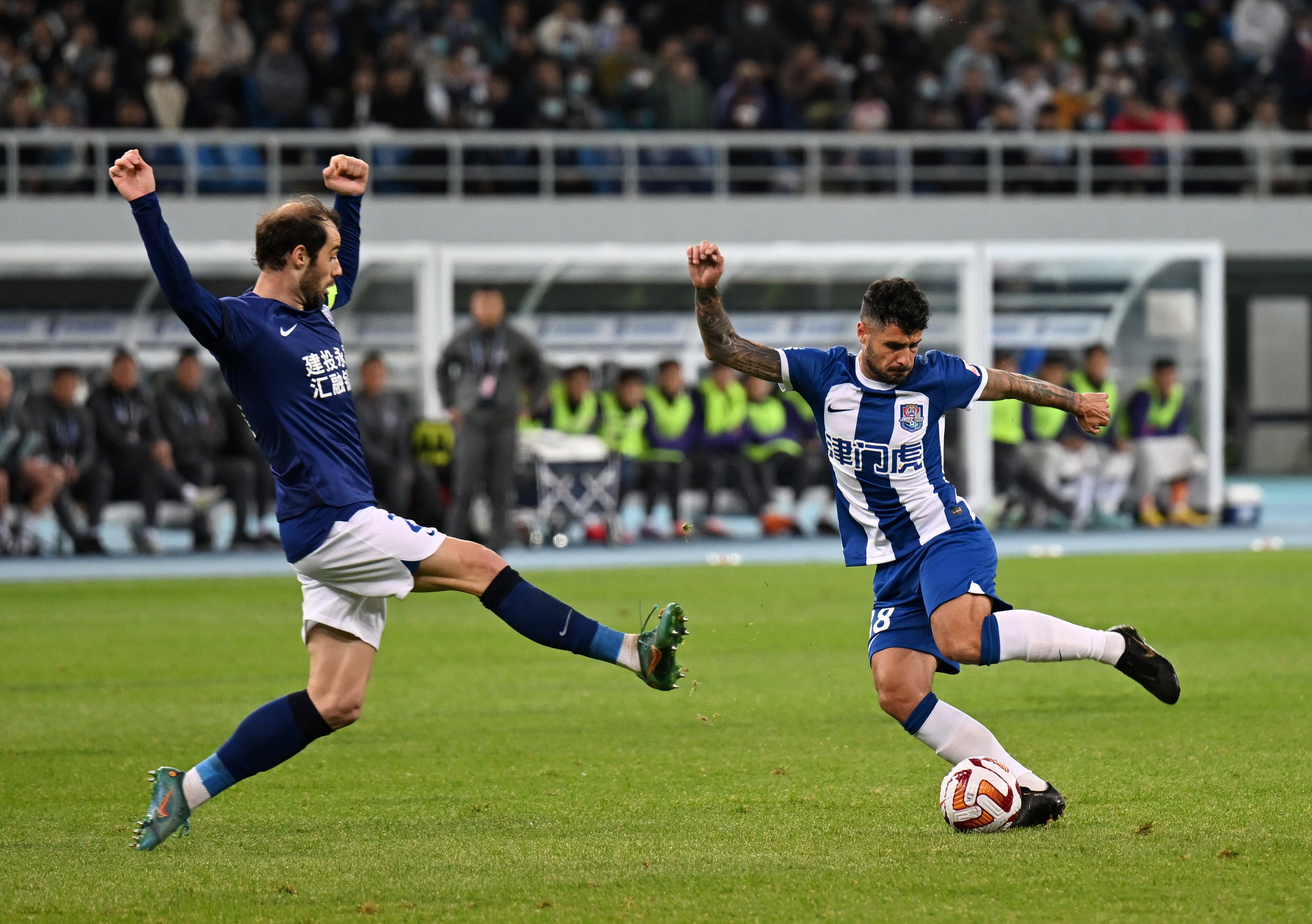 4月16日,天津津门虎队球员安杜哈尔(左二)在比赛中射门。新华社记者 孙凡越 摄