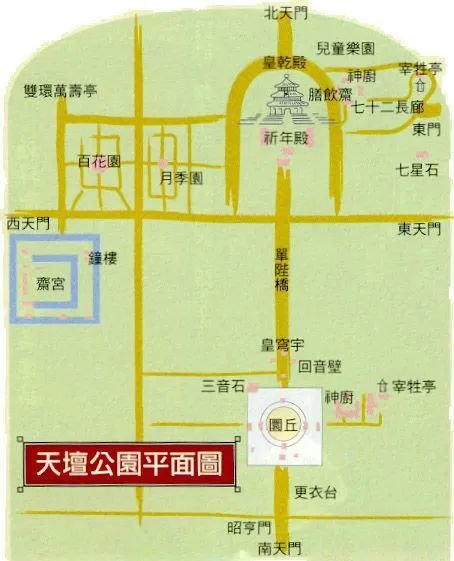 圜丘坛,周围有内外有两道矮墙,俗称“子墙”,墙面红色,上配有天青色琉璃瓦,象征天;内墙壁为圆形,外墙壁为方形,象征“天圆地方”。外墙的四周各有四门,南为昭亨门,北为成贞门,东为泰元门,西为广利门。这四个门的名称出自《易经•乾卦》的卦辞“元亨利贞”,是在赞美天的本质,也称之为天之“四德”:元始之原,无不亨通,和谐有利,正固持久。中间是祭天台,即圜丘。