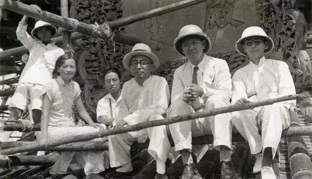 梁思成(左三)、林徽因(左二)等人在天坛祈年殿顶。
