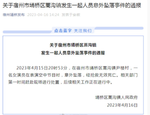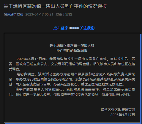 4月17日凌晨,安徽省宿州埇桥发布微信公众号发布《关于埇桥区蒿沟镇一演出人员坠亡事件的情况通报》表示,4月15日晚,埇桥区蒿沟镇发生一演出人员坠亡事件。事件发生后,埇桥区委、区政府已成立由公安、文旅等部门组成的调查组,相关涉事人员和单位正在接受调查。